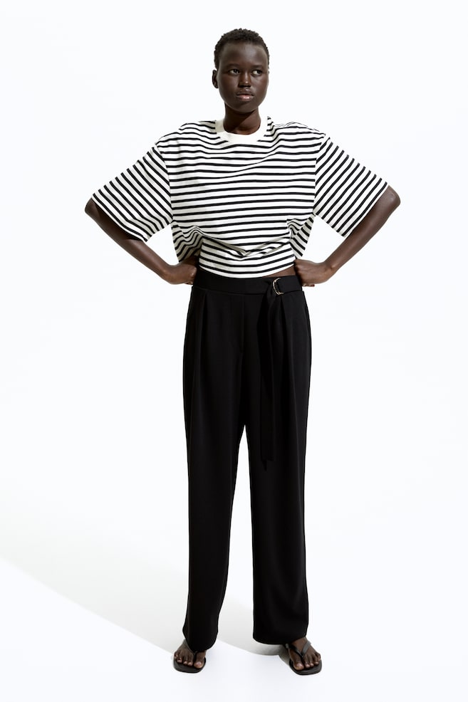 Элегантные брюки из джерси с высоким эластичным поясом, ложной гульфиком и пришитым поясом с металлическими D-образными кольцами с одной стороны. Зауженные штанины со складками спереди для создания привлекательного силуэта. Длина: Длинная Посадка: Высокая Покрой: Обычная Стиль: Зауженный