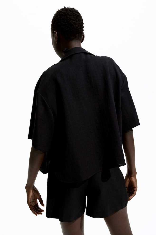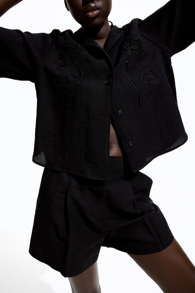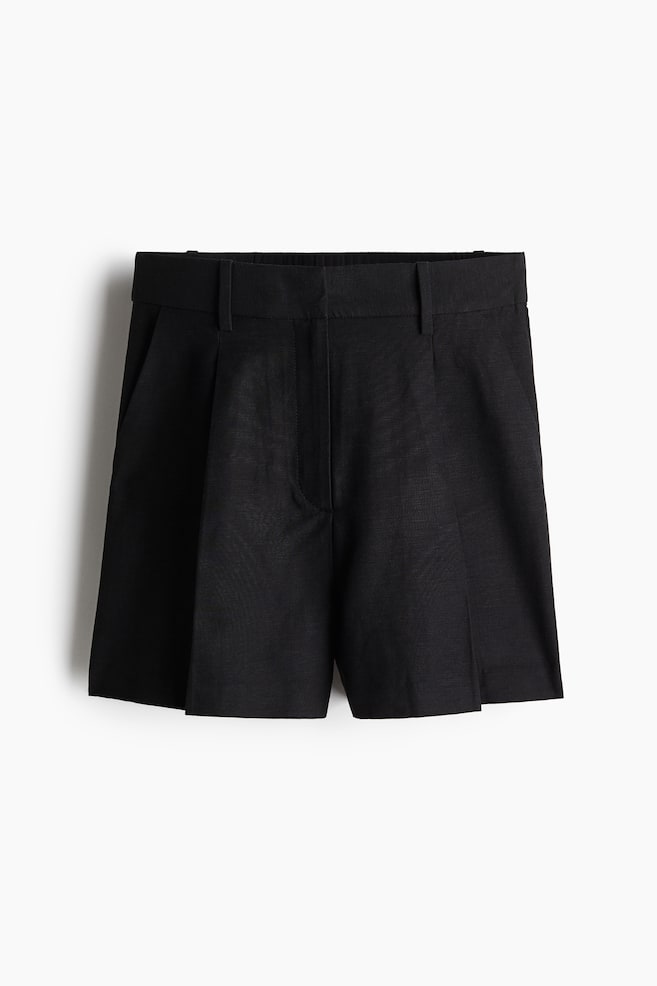 Элегантные плиссированные шорты из воздушной льняной ткани свободного кроя. Высокий пояс с резинкой сзади, застежка на молнию с потайной пуговицей и крючок. Косые боковые карманы и складки спереди и сзади. Размер: Длина по внутреннему шву: 9,5 см (размер 40) Длина: Короткая Талия: Высокая Покрой: Свободный