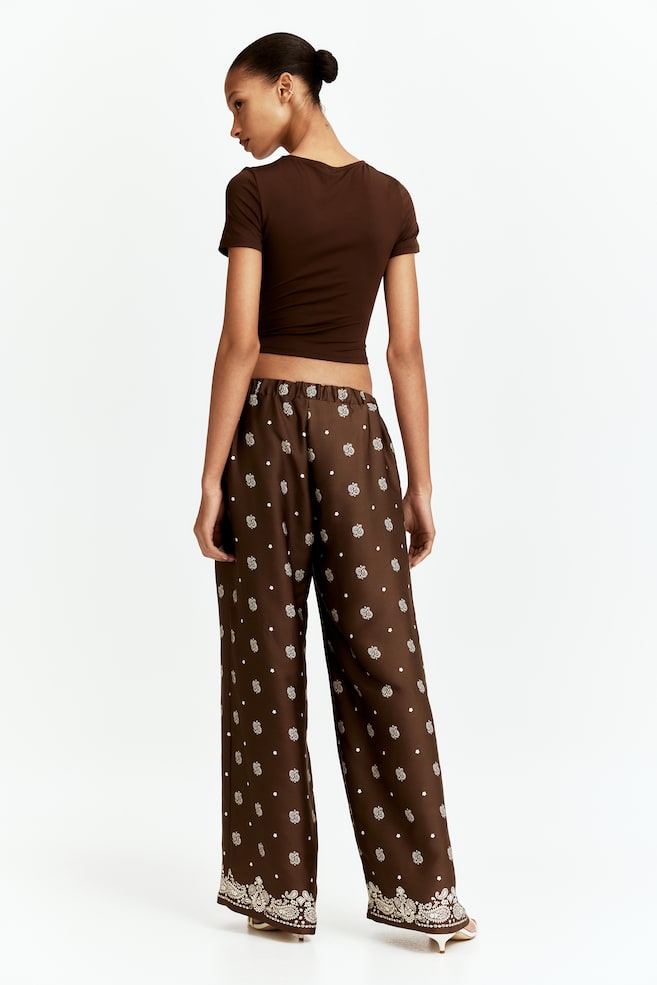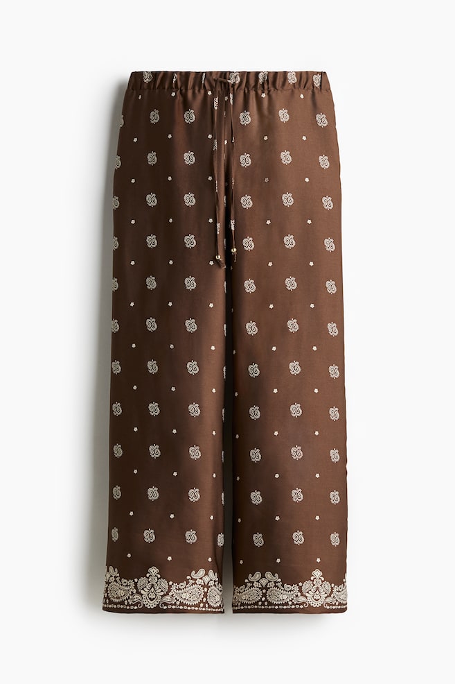 Брюки из ткани с обтянутым резинкой поясом и кулиской с жемчужинами на концах. Незаметные боковые карманы и широкие штанины. Длина: Длинная Посадка: Обычная талия Покрой: Обычная посадка Стиль: Брюки на завязках, широкие Концепция: DIVIDED