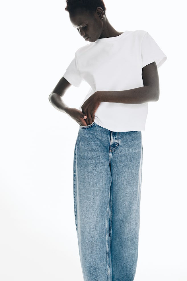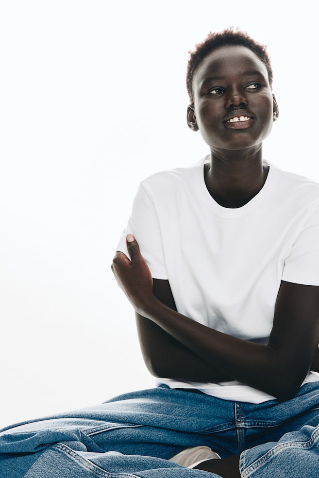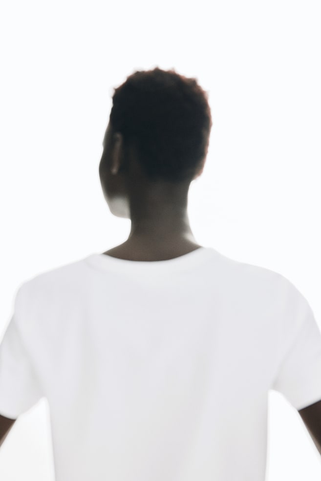 Футболка из плотного хлопкового трикотажа с круглым вырезом и ребристым воротником.