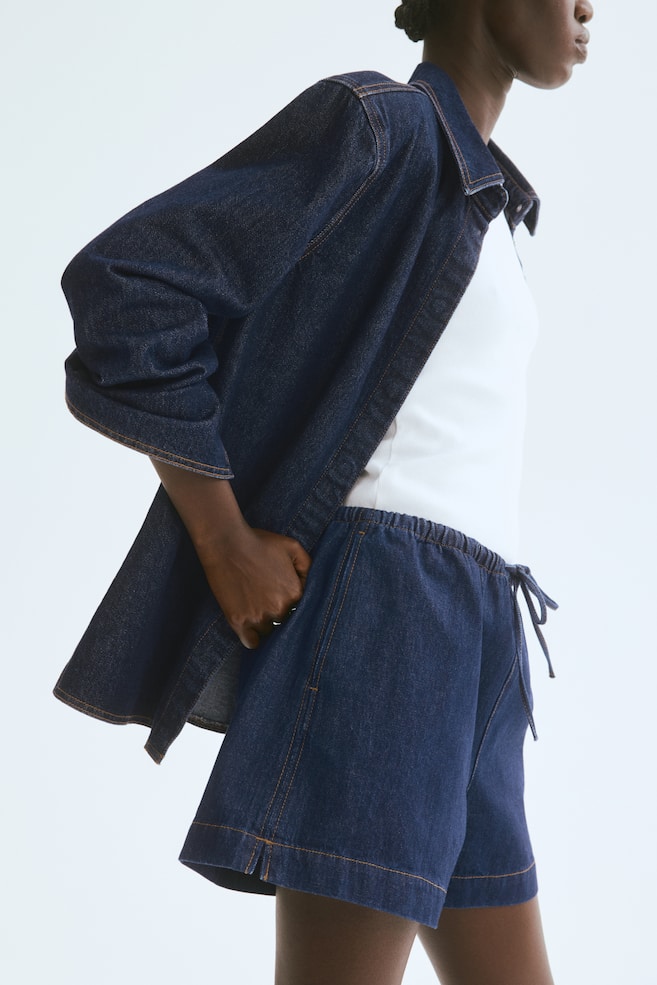 Свободные шорты из хлопчатобумажной джинсовой ткани с обтянутой резинкой и узким поясом на шнурке. Скромные боковые карманы и прямые манжеты штанин с небольшим боковым разрезом. Рост модели: Рост модели 180 см/5 футов 11 дюймов, на ней размер S. Рост: Длина по внутренней стороне штанины: 10,5 см (размер M) Длина: Короткая Посадка: Стандартная Покрой: Свободный