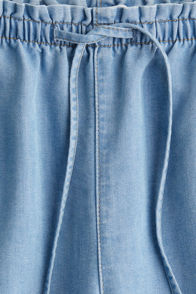 Брюки свободного кроя из мягкого денима. Модель с высокой талией, эластичным поясом на шнурке и небольшой оборкой сверху. Незаметные боковые карманы и широкие штанины. Размер: Длина по внутреннему шву: 76,5 см (размер M) Длина: Длинная Талия: Высокая талия Покрой: Свободный Стиль: Брюки-стринги Концепция: ДЖИНСОВАЯ