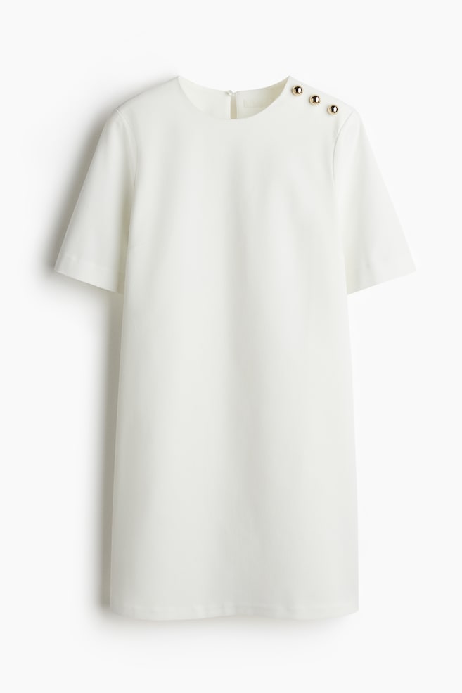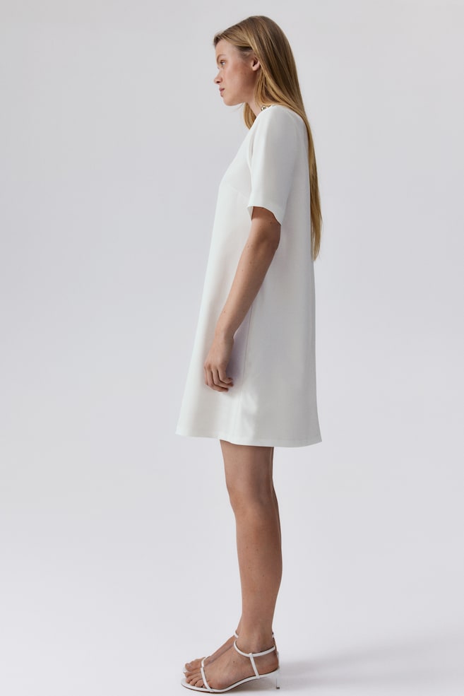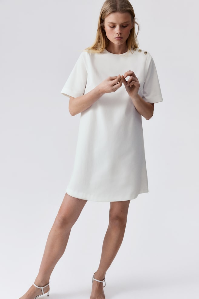 Короткое тканое платье с круглым вырезом и разрезом на горловине с потайной застежкой на пуговицу. Вытачки на груди, короткие рукава и прямой подол. Без подкладки. Размер: Рукав: Длина: 26,0 см (размер M) Спинка: Длина: 83,0 см (размер M) Плечо: Ширина: 40,5 см (размер M) Длина: Короткая Длина рукава: Короткий рукав Покрой: Обычная посадка Стиль: А-силуэт Вырез горловины: Круглый вырез