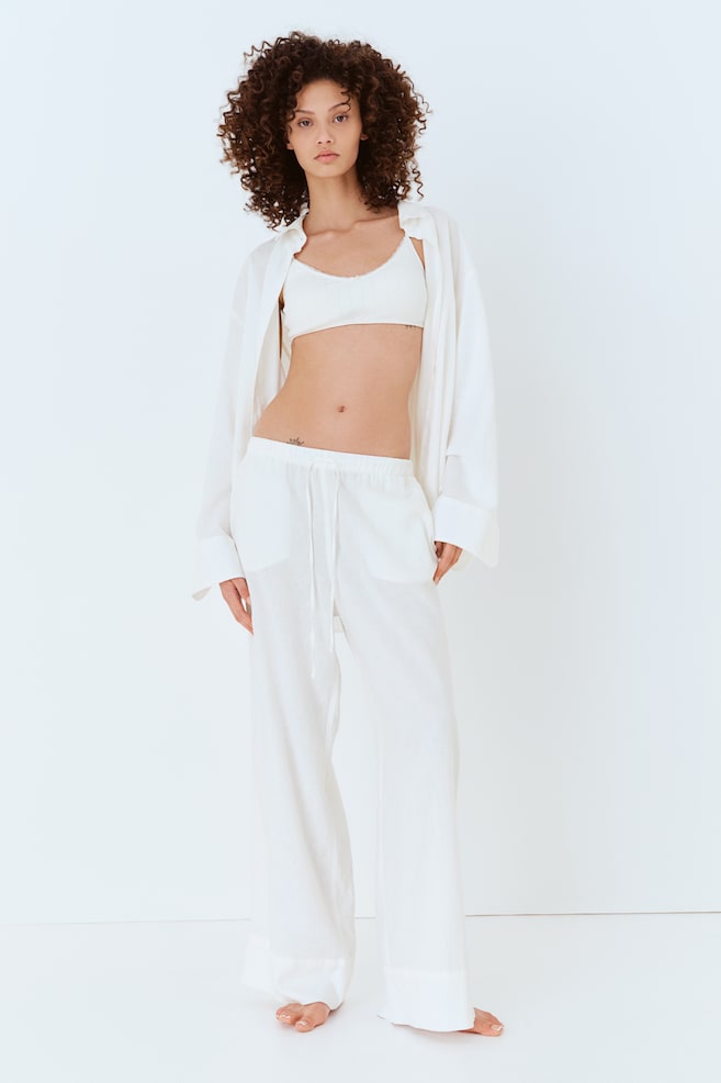 Брюки свободного кроя из льна/вискозы. Эластичный пояс со шнурком, незаметные боковые карманы и широкие штанины. Длина: Длинная Посадка: Обычная Покрой: Свободный Стиль: Широкий