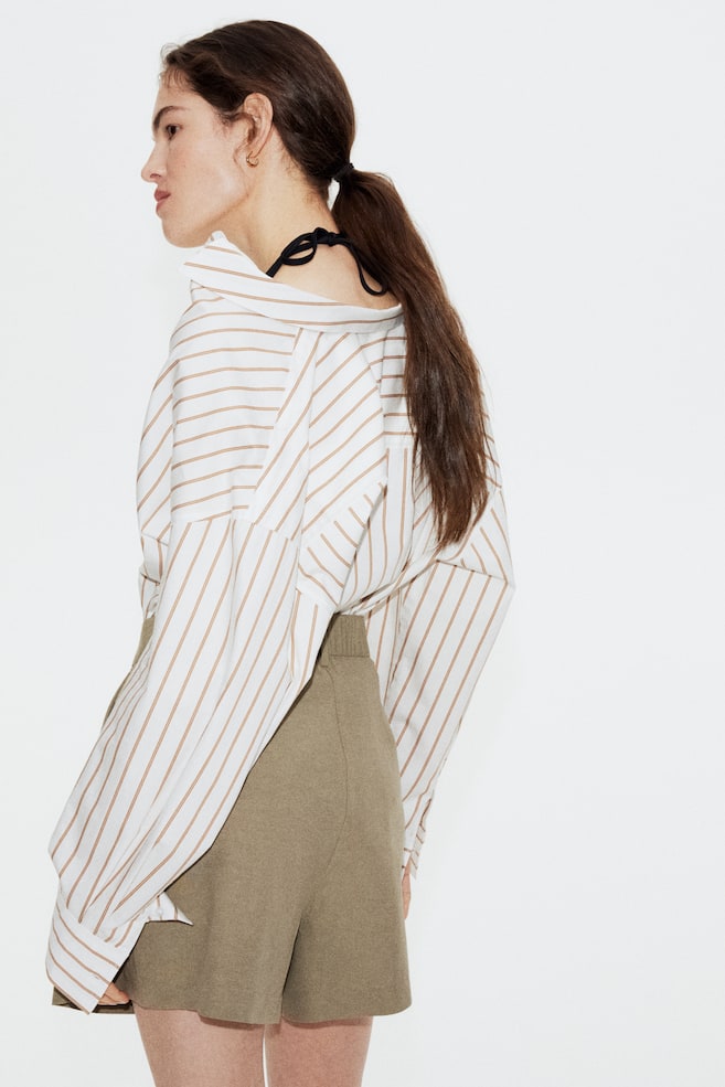 Элегантные плиссированные шорты из воздушной льняной ткани свободного кроя. Высокий пояс с резинкой сзади, застежка на молнию с потайной пуговицей и крючок. Косые боковые карманы и заутюженные складки спереди и сзади. Рост модели: Рост модели 178 см/5 футов 10 дюймов, на ней размер 38. Рост: Длина по внутренней стороне штанины: 9,5 см (размер 40) Длина: Короткая Посадка: Высокая Покрой: Свободный