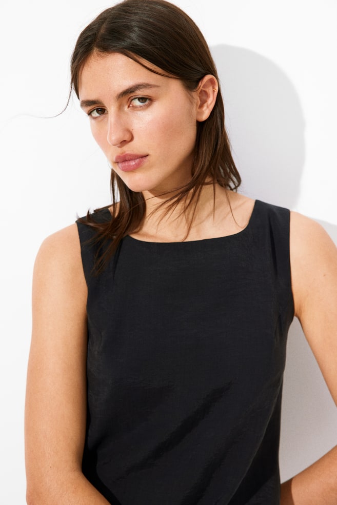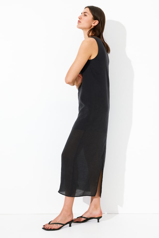 Платье без рукавов длиной до щиколотки из нежной ткани с квадратным вырезом и потайной застежкой-молнией сзади. Прямой подол с разрезом. Частично на подкладке.