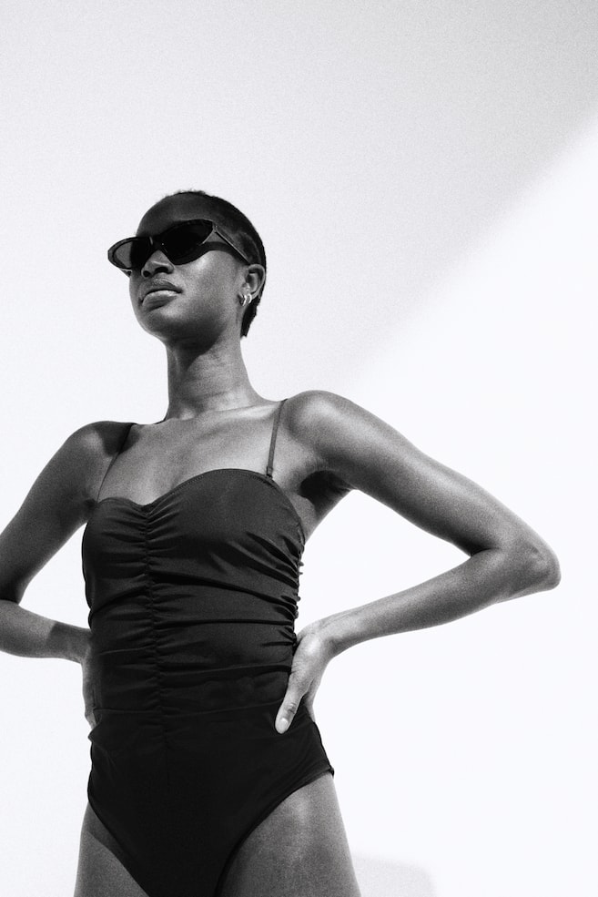 Купальник-бандо на подкладке. Купальник имеет облегающий крой с утягивающим эффектом на талии. Сборка по шву спереди и сзади для облегающего эффекта, вырез сердечком спереди и V-образный вырез сзади. Съемные регулируемые бретели и мягкие чашечки придают форму груди и обеспечивают хорошую поддержку. Средняя степень покрытия спины. Рост модели: Модель 178 см/5 футов 10 дюймов, на ней размер S. Фасон: бандо, бразильское, драпированное, бюстгальтер с подкладками, низкая спина Вырез: сердечко
