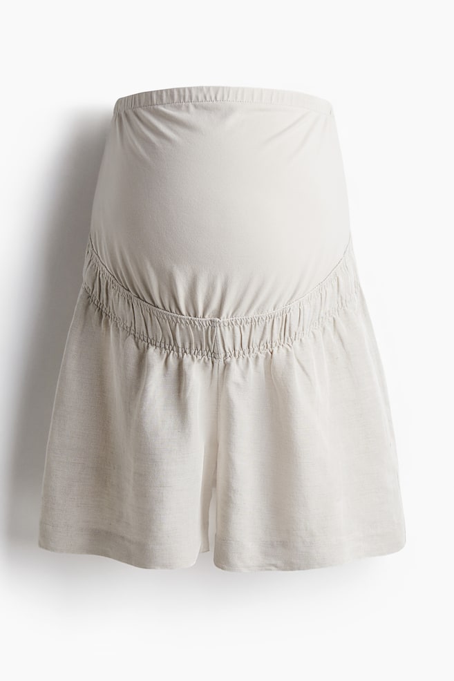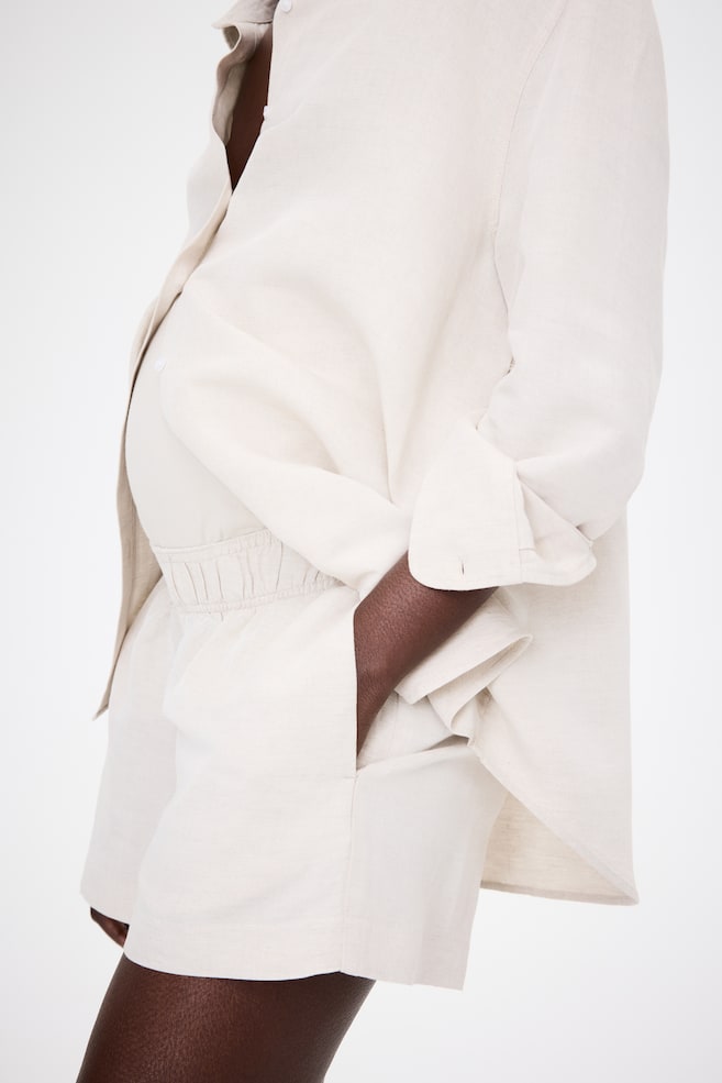 Повседневные шорты из воздушной смеси льна и вискозы с эластичным поясом и широким трикотажным поясом для идеальной посадки на животе. Незаметные боковые карманы. Размер: Длина по внутренней стороне штанины: 12,5 см (размер M) Длина: Короткая Талия: Высокая Покрой: Свободный Концепция: MAMA