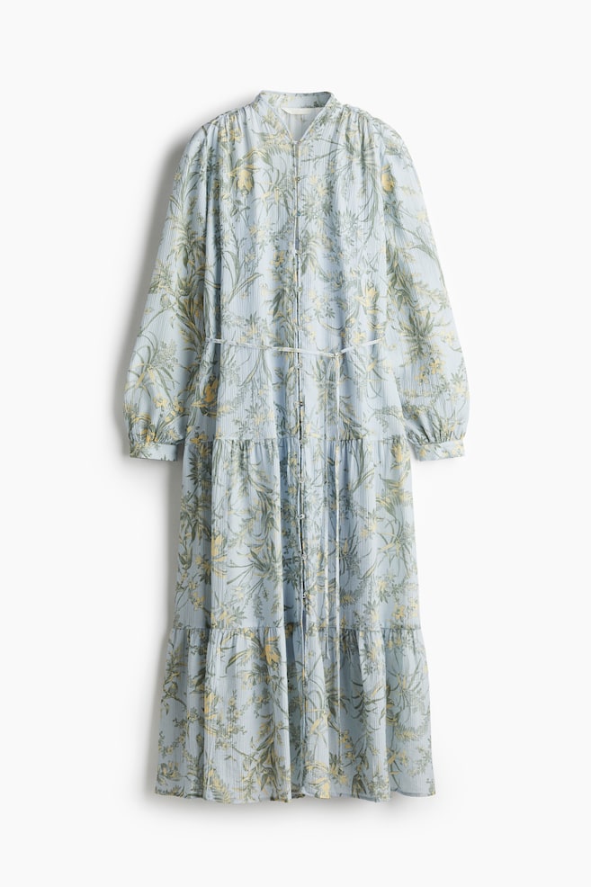 Платье свободного кроя длиной до щиколотки из воздушной жатой ткани с небольшим воротником, планкой на пуговицах и узким съемным поясом на талии. Слегка приспущенная линия плеча и длинные рукава-фонарики с узкими манжетами на пуговицах. Присборенные плечевые швы и расклешенная юбка со сборками для дополнительного объема. Трикотажная комбинация. Рост модели: Модель ростом 180 см/5 футов 11 дюймов, на ней размер M. Размер: Спинка: Длина: 130,0 см (размер M) Длина: Длинная Длина рукава: Длинный рукав Покрой: Оверсайз Воротник: Воротник-стойка Стиль: Расклешенный Фасон рукава: Рукав-фонарик