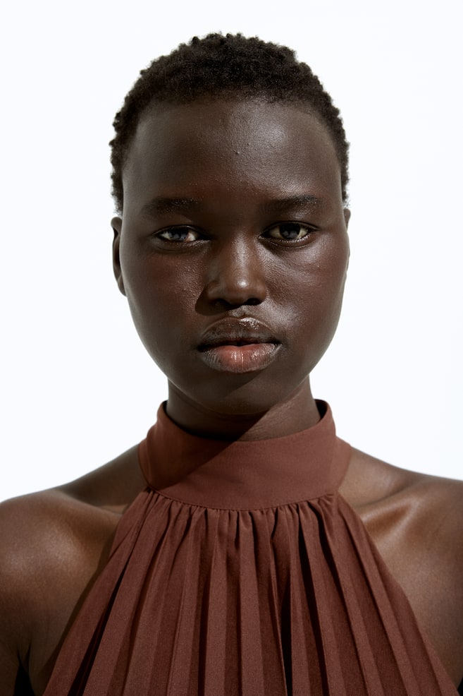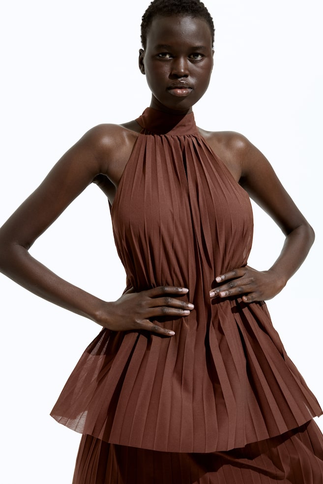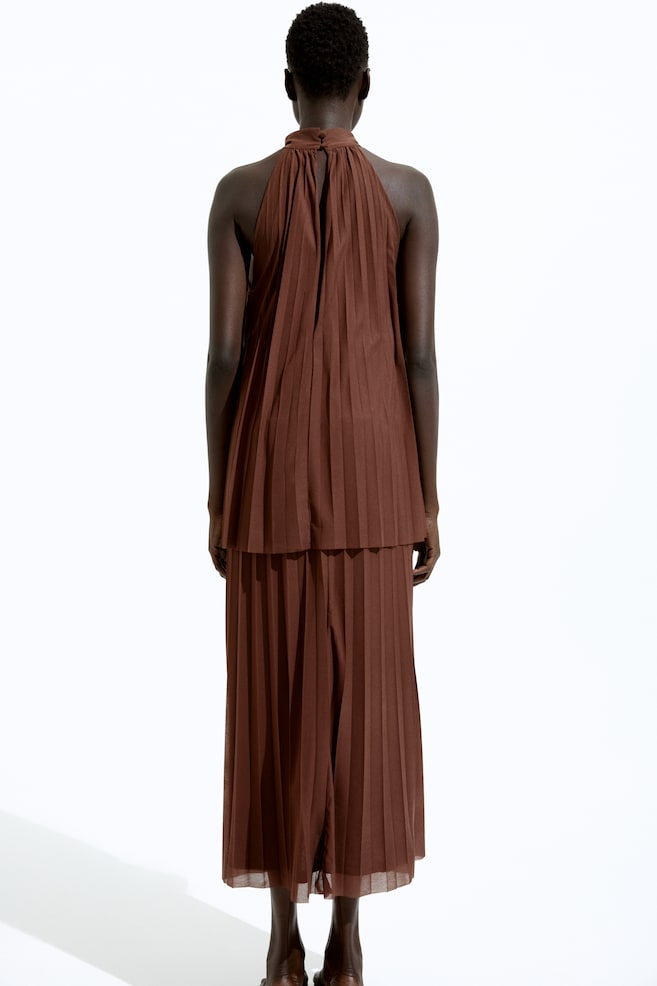 Многослойное платье без рукавов длиной до щиколотки из плиссированного трикотажа. Воротник-стойка и вырез-замочная скважина с застежкой на обтянутые пуговицы сзади. На подкладке. Размер: Длина по спинке: 134,0 см (размер M) Длина: Средняя Длина рукава: Без рукавов Покрой: Свободный Стиль: А-силуэт Вырез горловины: Американский халтер