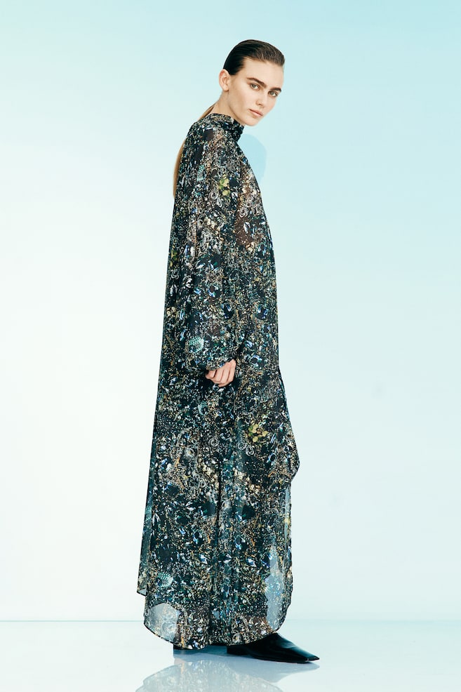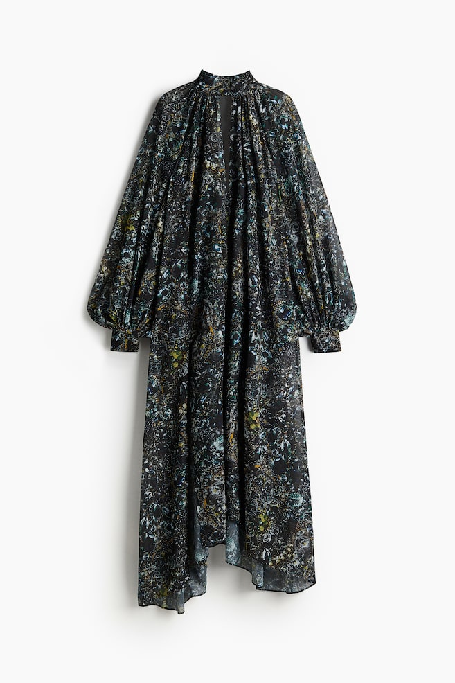 Коллекция H&M Studio Коллекция Studio. Платье длиной до щиколотки из прозрачного шифона с узором, напоминающим сверкающие драгоценности. Плиссированный воротник-стойка со сборками, глубокий разрез спереди и длинные широкие завязки на шее создают драматичный эффект. Длинные, объемные рукава-фонарики с обтягивающими манжетами на обтянутых пуговицах. Асимметричный подол. Для легкости эта модель не имеет подкладки. Размер: Рукав: Длина: 62,5 см (размер M) Плечо: Ширина: 51,5 см (размер M) Спинка: Длина: 128,0 см (размер M) Длина: Длинная Длина рукава: Длинный рукав Покрой: Обычный покрой Воротник: Воротник-стойка Стиль: Драпированный, Замочная скважина, Разрез Тип рукава: Рукава-баллоны Коллекция: H&M Studio Collection