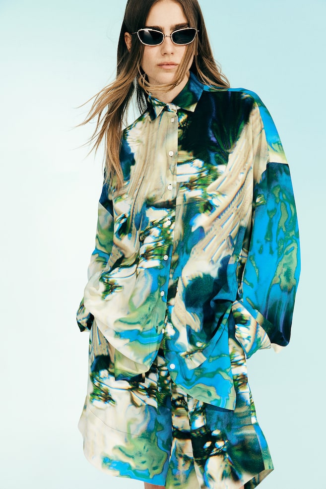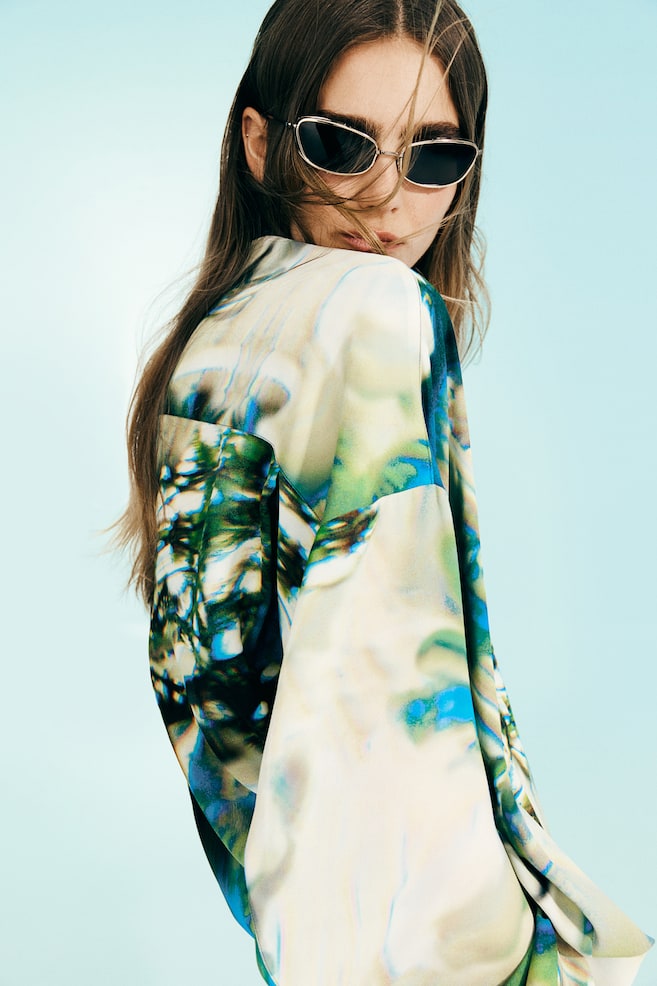 Коллекция H&M Studio Коллекция Studio. Длинная блузка свободного кроя из креп-шифона с размытым абстрактным рисунком. С вырезным воротником, пуговицами спереди и двухслойной плиссированной кокеткой сзади. Предварительно отстроченные плечевые швы, сильно спущенная линия плеча и длинные рукава с застежкой на пуговицу на рукаве и манжетами на пуговицах. Закругленный подол сзади и присборенные боковые швы создают силуэт «кокон». Удлиненный крой сзади. Рост модели: Рост модели 178 см/5 футов 10 дюймов, на ней размер S. Рост: Плечо: Ширина: 75,0 см (размер M) Рукав: Длина: 51,5 см (размер M) Длина: Длинный Длина рукава: Длинный рукав Покрой: Свободный Воротник: Отложной воротник Коллекция: H&M Studio Collection