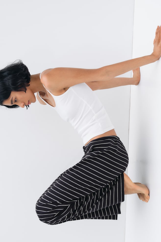 Широкие повседневные брюки из ребристого трикотажа с заниженной талией, потайной резинкой и узким шнурком. Размер: Длина по внутреннему шву: 77,0 см (размер M) Длина: Длинная Посадка: Заниженная талия Покрой: Свободный покрой Стиль: Брюки на завязках, широкие