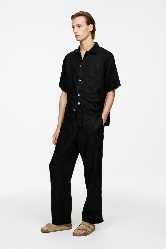 Льняные брюки свободного покроя. Модель надевается через голову, с эластичным поясом на шнурке. Карманы в боковых швах.