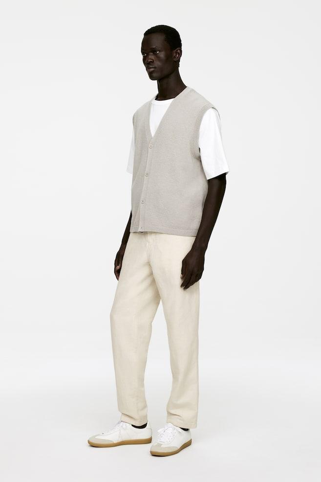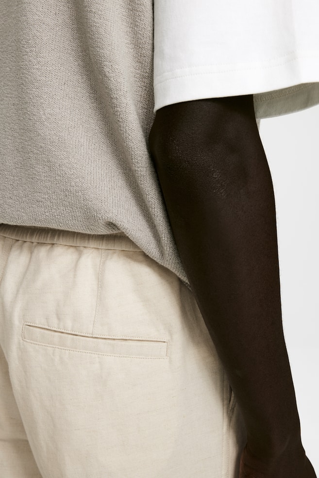 Брюки из льняной смеси. Снабжена эластичным поясом со шнурком и застежкой на пуговицу и молнию. Наклонные передние карманы и прорезные задние карманы. Обычная посадка.