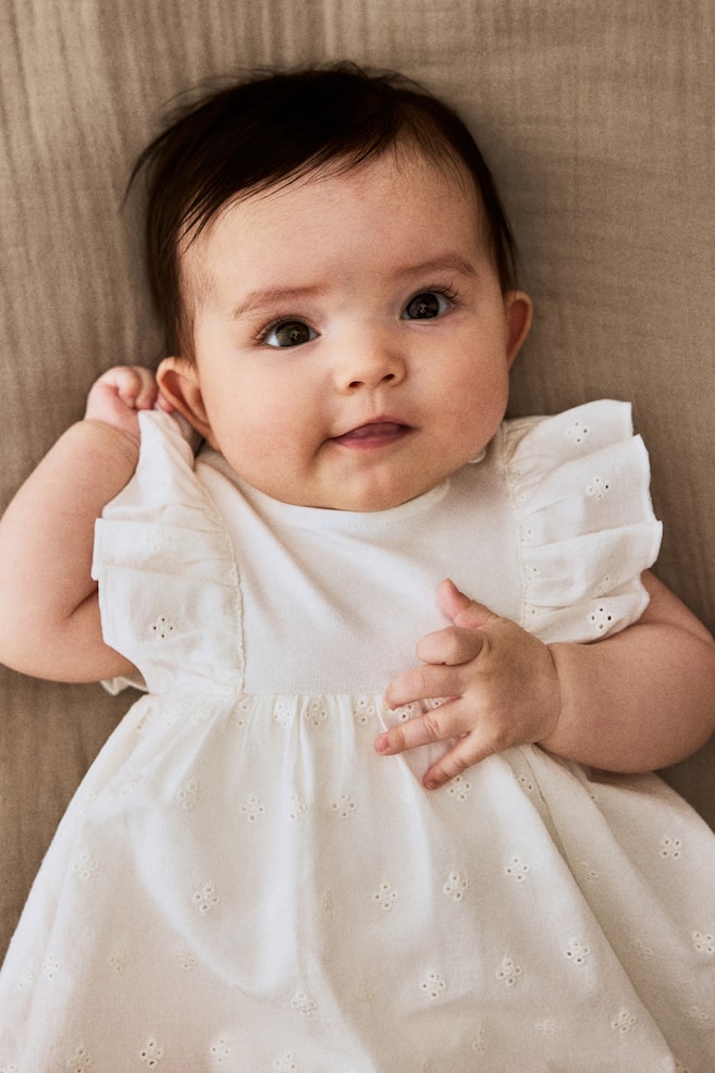 Платье без рукавов из хлопка с интегрированным боди из мягкого трикотажа. Платье имеет круглый вырез с застежками-кнопками на плечах и оборку спереди, которая продолжается на спинку. Посередине — сборчатый разделительный шов и объемная юбка с шитьем «англез». Боди с застежками-кнопками в промежности и присборенными швами вокруг отверстий для ног для более удобной посадки и идеальной посадки вокруг подгузника. Длина: миди Длина рукава: без рукавов Покрой: стандартный Вырез горловины: круглый