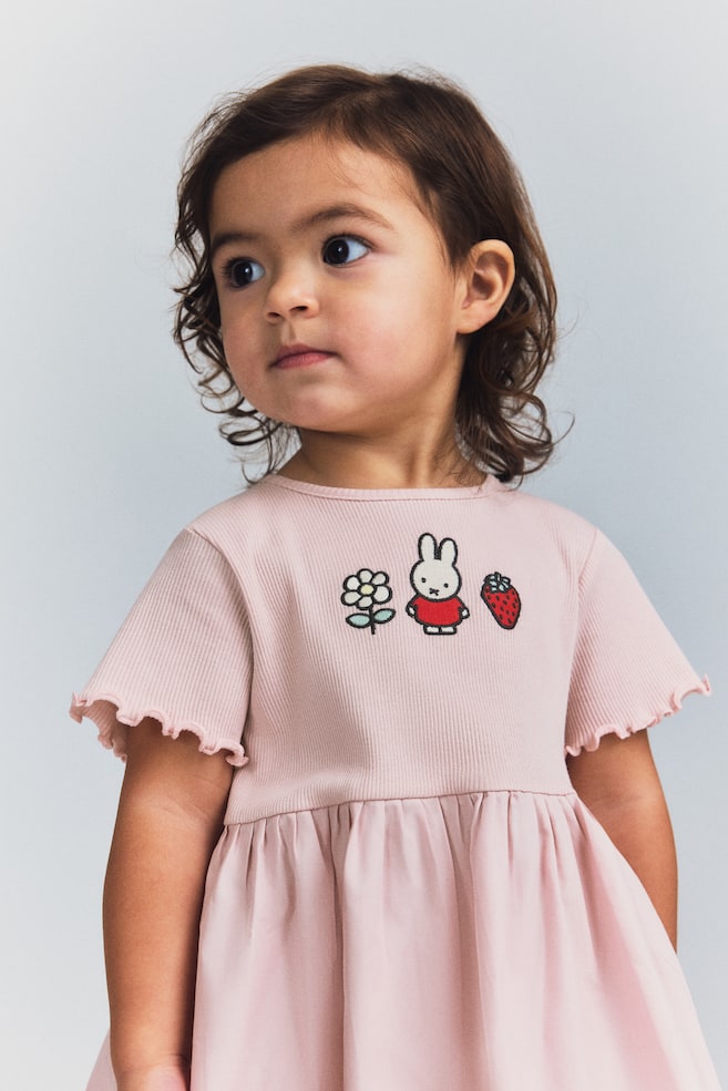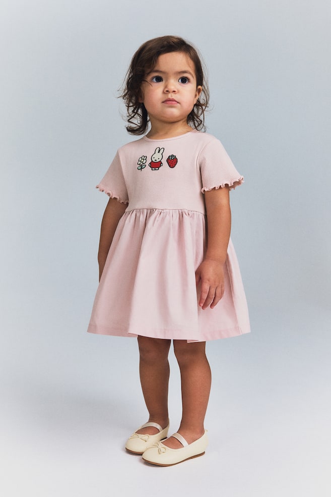 Платье из мягкого хлопка с верхом из ребристого джерси с вышитыми деталями спереди и юбкой из поплина. Круглый вырез горловины с застегивающейся на пуговицы замочной скважиной и короткими рукавами с оверлочной отделкой. Присборенный разделительный шов и расклешенная, объемная юбка.
