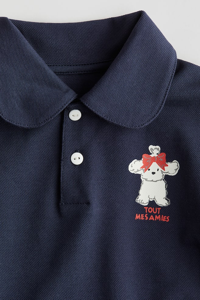 Платье из мягкого хлопкового пике с небольшим принтом сверху. Воротник «Питер Пэн», застежка на пуговицы и короткие рукава с узкими манжетами. Расклешенная плиссированная юбка.