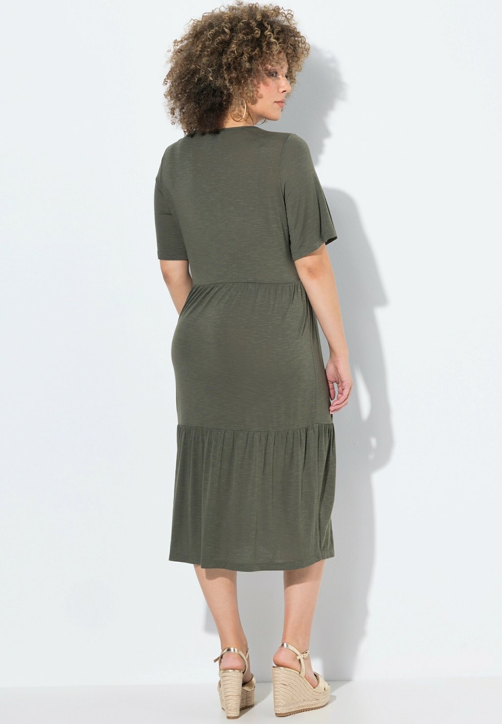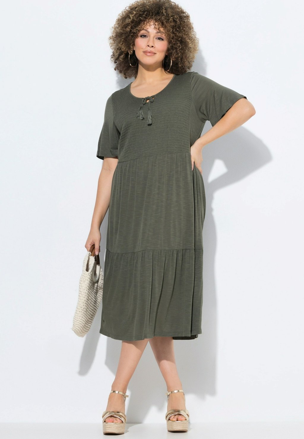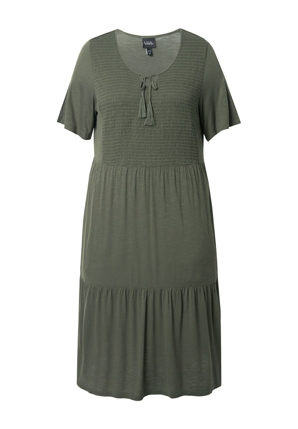 Платье из джерси SMOCKED BODICE SHORT SLEEVE FLOUNCE PANEL Ulla Popken, оливковый