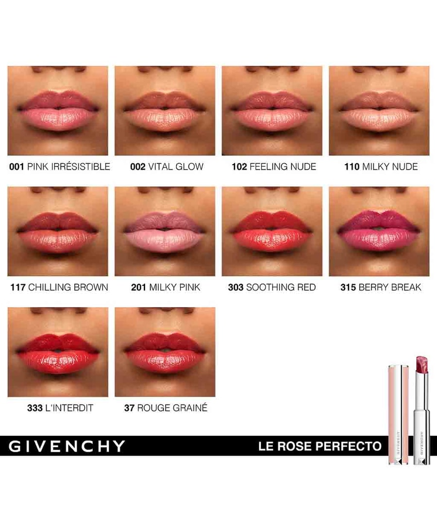 Откройте для себя естественную красоту губ с помощью Rose Perfecto, модного бальзама для губ от Givenchy, который сочетает в себе свежий стойкий цвет с не менее стойким увлажнением. 95% натуральная формула * содержит розовое масло, гиалуроновую кислоту, витамин С, розовый перец и масло ши для создания бальзама для губ, который увлажняет ** в течение 24 часов и обеспечивает 8-часовой эффект набухания ***. Обладая кремообразной приятной текстурой, Rose Perfecto питает и увлажняет губы - как сразу после нанесения, так и в течение всего дня. Доступен в десяти ярких оттенках, включая оттенок с регулируемым pH с 8-часовым сроком хранения для индивидуального цвета, а также девять оттенков под мрамор с 6-часовым сроком хранения *** для сияющего покрытия, и в нежно-розовом кожаном футляре от кутюр. Для максимального естественного сияния смешайте бальзам для губ Rose Perfecto с компактным кремом Givenchy L'Intemporel Blossom, чтобы обеспечить цвет лица 24-часовым увлажняющим **** и солнцезащитным кремом SPF 15/PA+.