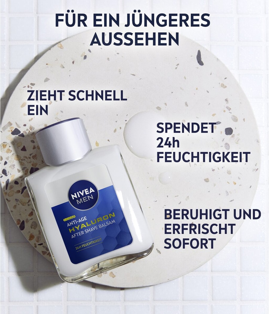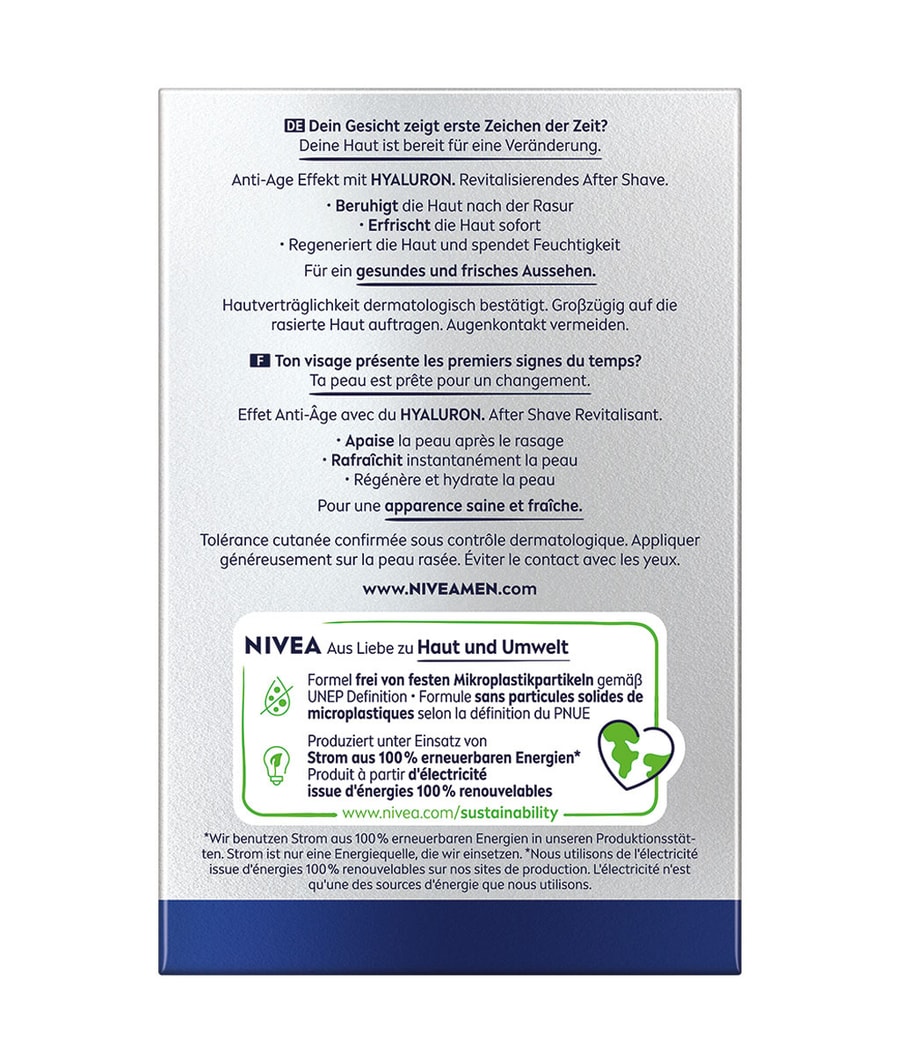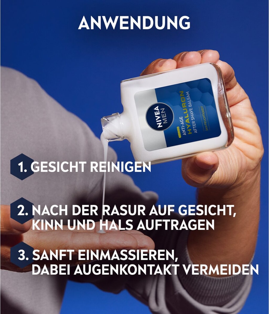На твоем лице появляются первые признаки времени? Ваша кожа готова к изменениям с помощью антивозрастного гиалуронового бальзама после бритья NIVEA MEN. Благодаря формуле с гиалуроновой кислотой бальзам после бритья успокаивает кожу после бритья и мгновенно освежает ее. Раздражение кожи немедленно снимается, и это способствует увлажнению кожи. Кожа будет оживлена и увлажнена в течение 24 часов. Для здорового и свежего образа: МУЖСКОЙ антивозрастной гиалуроновый бальзам NIVEA после бритья. Шаг 1: Очистите лицо. Шаг 2: Нанесите на лицо, подбородок и шею после бритья. Шаг 3: Аккуратно помассируйте, избегая попадания в глаза.