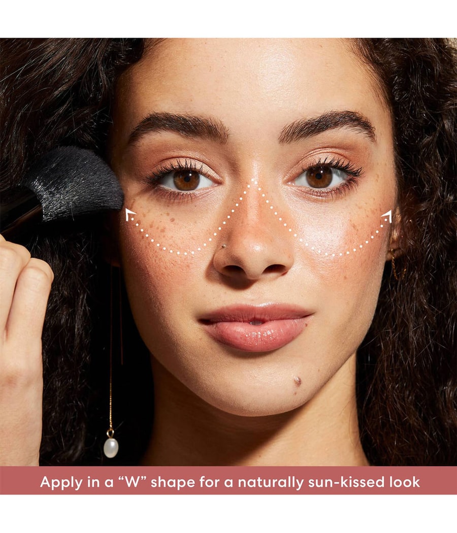 Нанесите Blonzer Blush + бронзер в форме буквы „W”, чтобы создать естественный, поцелованный солнцем вид на основных чертах лица:начните с внешней переносицы носа и нанесите Blonzer в форме буквы „U“ вниз к щеке и вверх к скулам.Повторите движение на другой стороне лица. Соедините букву „W“ непрерывным растушевкой от одной щеки через нос к другой щеке.