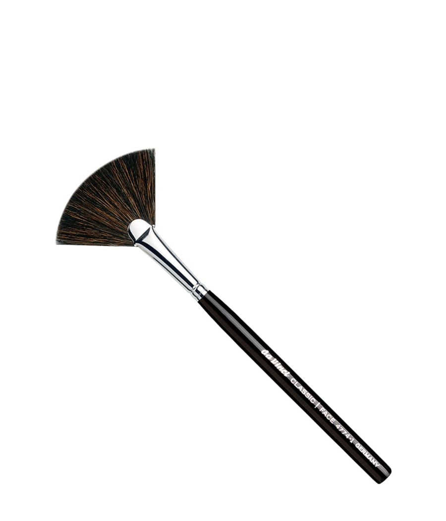 Эта веерная кисть обеспечивает точное нанесение румян или мелирований. Он также подходит для нанесения мелких и крупных блестящих частиц. Кроме того, он позволяет стирать излишки пудры и остатки теней для век.