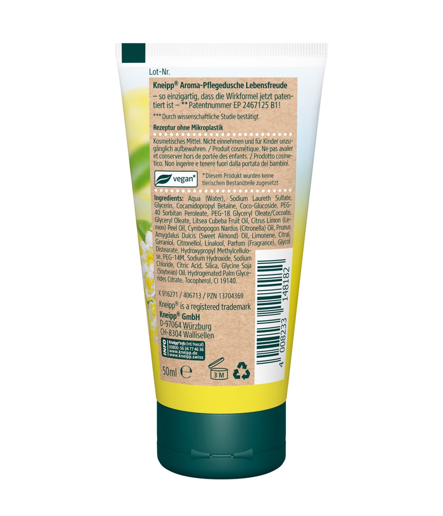 Душ для ухода за ароматом Kneipp Радость жизни - настолько уникальный, что его формула действия теперь запатентована - номер патента EP 2467125 B1! Наслаждайтесь красотой жизни с бодрящим и активизирующим ароматизирующим душем Kneipp для ухода за кожей. радость жизни. Доказано, что свежий, солнечный аромат натуральных эфирных масел Litsea Cubeba и лимона поднимает вам настроение ***. Душ с лечебной формулой на растительной основе улучшает самочувствие кожи во время и после душа. Формула с натуральным питательным маслом обеспечивает нежную и эластичную кожу. Исследование*** подтверждает, что увлажнение кожи сохраняется при нанесении. *** Подтверждено научным исследованием. Рецепт без микропластика.