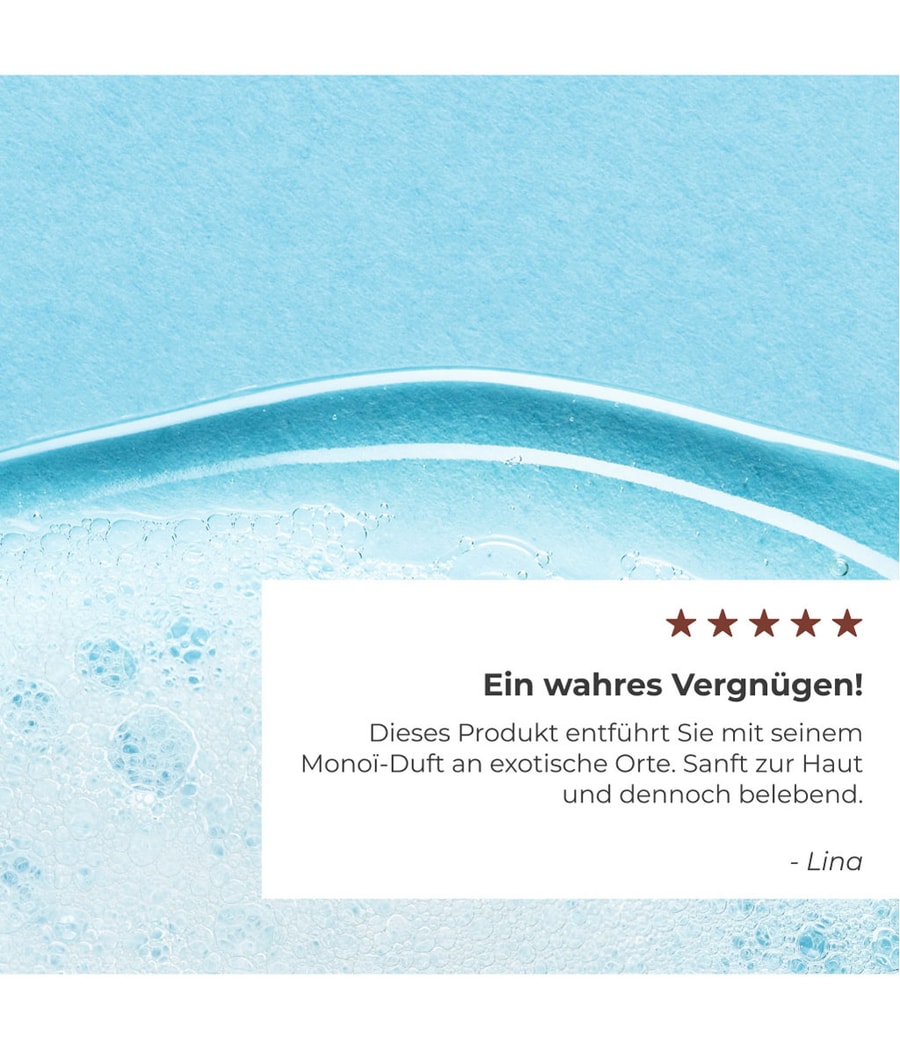 Нанесите мягкий шампунь для душа Monoï на тело и волосы в душе. Затем тщательно промойте.