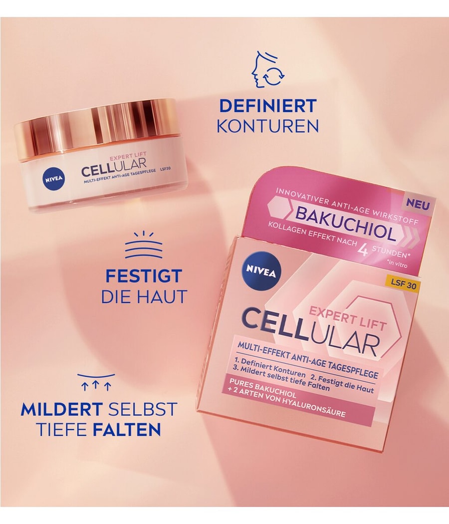 Дневной уход NIVEA CELLULAR Expert Lift SPSF 30 с бакучиолом помогает укрепить кожу и укрепить ее волокна.* Дневной крем против старения основан на инновационной формуле чистого бакучиола, нового поколения антивозрастных средств от NIVEA, а также микро- и макрогиалуроновой кислоты. Эти альтернативы ретинолу поддерживают активность клеточного коллагена уже через 4 часа после нанесения, обеспечивая при этом интенсивное увлажнение. В отличие от ретинола, бакучиол при этом не вызывает раздражения кожи. Это позволяет использовать уход утром и вечером.Откройте для себя полную подъемную силу серии Cellular Expert Lift.* Протестировано на клетках кожи / доказано в пробирке на бакучиол.