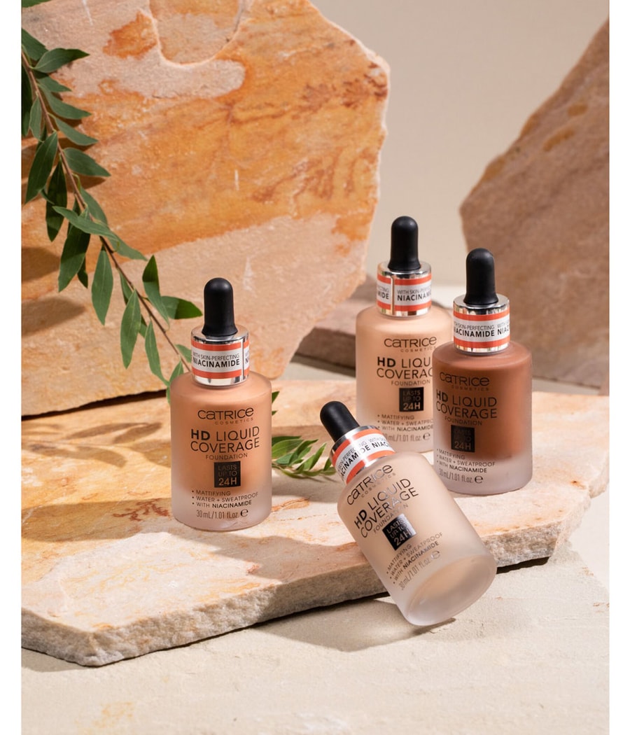 Почувствуйте волшебство макияжа: Жидкая основа для макияжа Catrice HD придает вашей коже бархатисто-матовый, безупречный цвет лица. Это похоже на волшебство. Но это не так, это макияж. Жидкая основа обладает эффектом второй кожи. Он обладает приятной мягкой текстурой с высоким и в то же время естественным покрытием без эффекта маски, обеспечивая ровную и матовую поверхность. Она скрывает пятна и смягчает покраснения. Их формула обогащена ниацинамидом, улучшающим состояние кожи, и не содержит парабенов и микропластических частиц. Жидкая основа для покрытия Catrice HD является водостойкой, устойчивой к поту и переносимой, поэтому ее срок службы составляет до 24 часов.