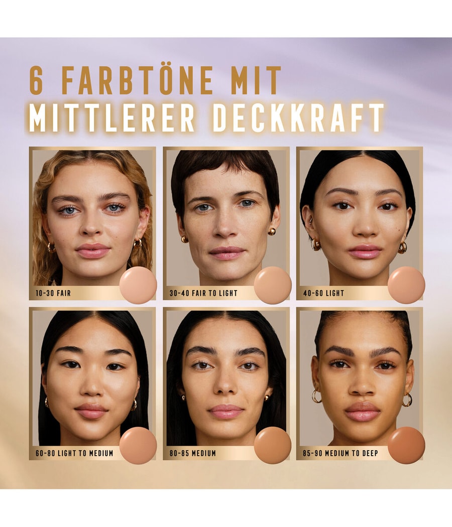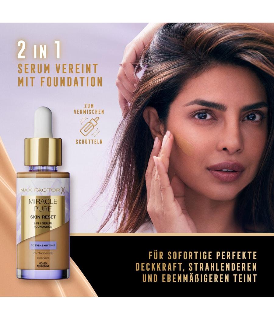 Ready. Сброс. Go – mit der Max Factor Miracle Pure Skin Reset Foundation. Формула 2-в-1 сочетает в себе питательную сыворотку и жидкую основу с балансирующим эффектом, придавая коже более ровный вид. Эффект усиливается за счет комплекса Reset с 2% ниацинамидом и бисабололом, который питает кожу и придает ей здоровое сияние. Тональный крем обеспечивает среднее покрытие с шелковисто-матовой отделкой и обеспечивает естественный сияющий цвет лица, доступный в шести оттенках. Веганская формула прошла клинические и дерматологические испытания и подходит даже для чувствительной кожи.
