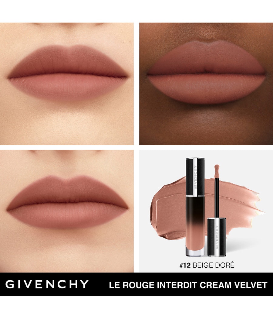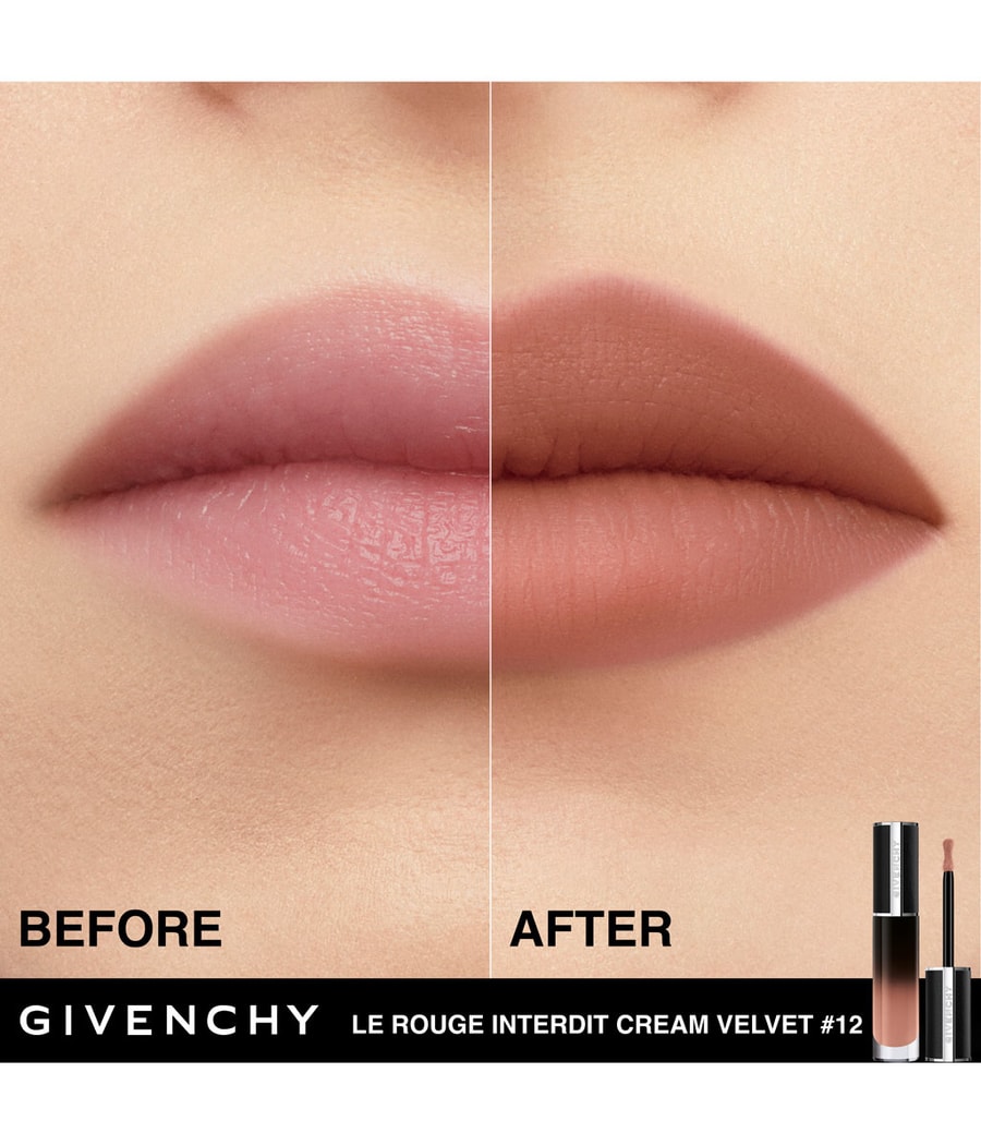 Откройте для себя эффект мягкого фокуса от новой кремово-матовой помады интенсивного цвета Givenchy Le Rouge Interdit Cream Velvet. Ультрасенсорная формула обеспечивает 12 часов увлажнения *** и обволакивает губы 12-часовой стойкостью ** и комфортом при ношении *. Первая жидкая кремовая помада от Givenchy, которая сочетает в себе незаметно легкую бархатистую пленку с невероятной интенсивностью цвета. Le Rouge Interdit Cream Velvet имеет современную модную кепку из натуральной черной кожи и одета в прозрачный стеклянный флакон с элегантным черным градиентом. Футляр украшен серебряной эмблемой 4G и напоминает логотип дома в стиле Givenchy Couture. Упаковка изготовлена из стекла и на 30% из переработанного пластика. Это часть концепции сокращения использования ископаемого пластика на 30% к 2025 году (по сравнению с 2017 годом). Помада доступна в 13 оттенках с высокой пигментацией, которые создают матовый эффект мягкого фокуса и подходят к любому тону кожи.