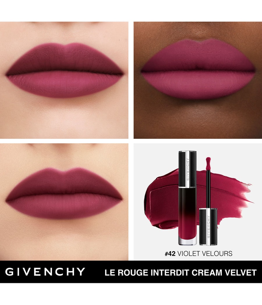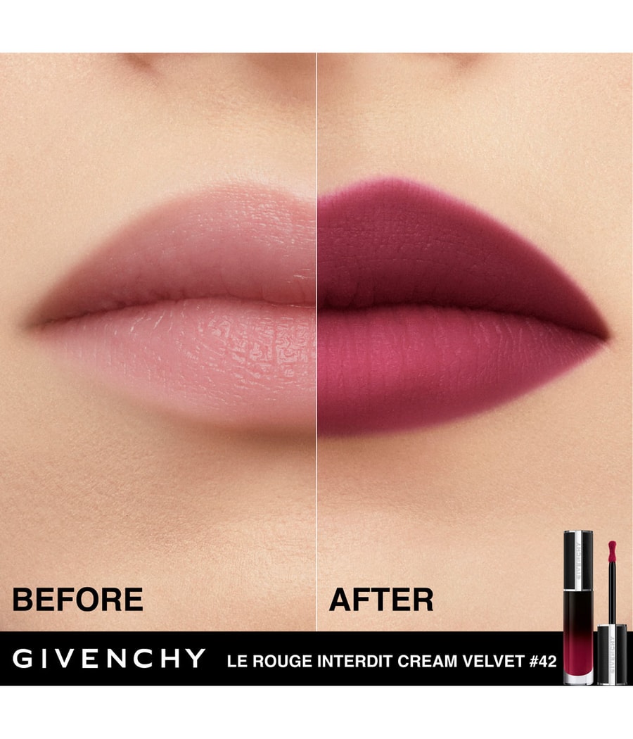 Откройте для себя эффект мягкого фокуса от новой кремово-матовой помады интенсивного цвета Givenchy Le Rouge Interdit Cream Velvet. Ультрасенсорная формула обеспечивает 12 часов увлажнения *** и обволакивает губы 12-часовой стойкостью ** и комфортом при ношении *. Первая жидкая кремовая помада от Givenchy, которая сочетает в себе незаметно легкую бархатистую пленку с невероятной интенсивностью цвета. Le Rouge Interdit Cream Velvet имеет современную модную кепку из натуральной черной кожи и одета в прозрачный стеклянный флакон с элегантным черным градиентом. Футляр украшен серебряной эмблемой 4G и напоминает логотип дома в стиле Givenchy Couture. Упаковка изготовлена из стекла и на 30% из переработанного пластика. Это часть концепции сокращения использования ископаемого пластика на 30% к 2025 году (по сравнению с 2017 годом). Помада доступна в 13 оттенках с высокой пигментацией, которые создают матовый эффект мягкого фокуса и подходят к любому тону кожи.