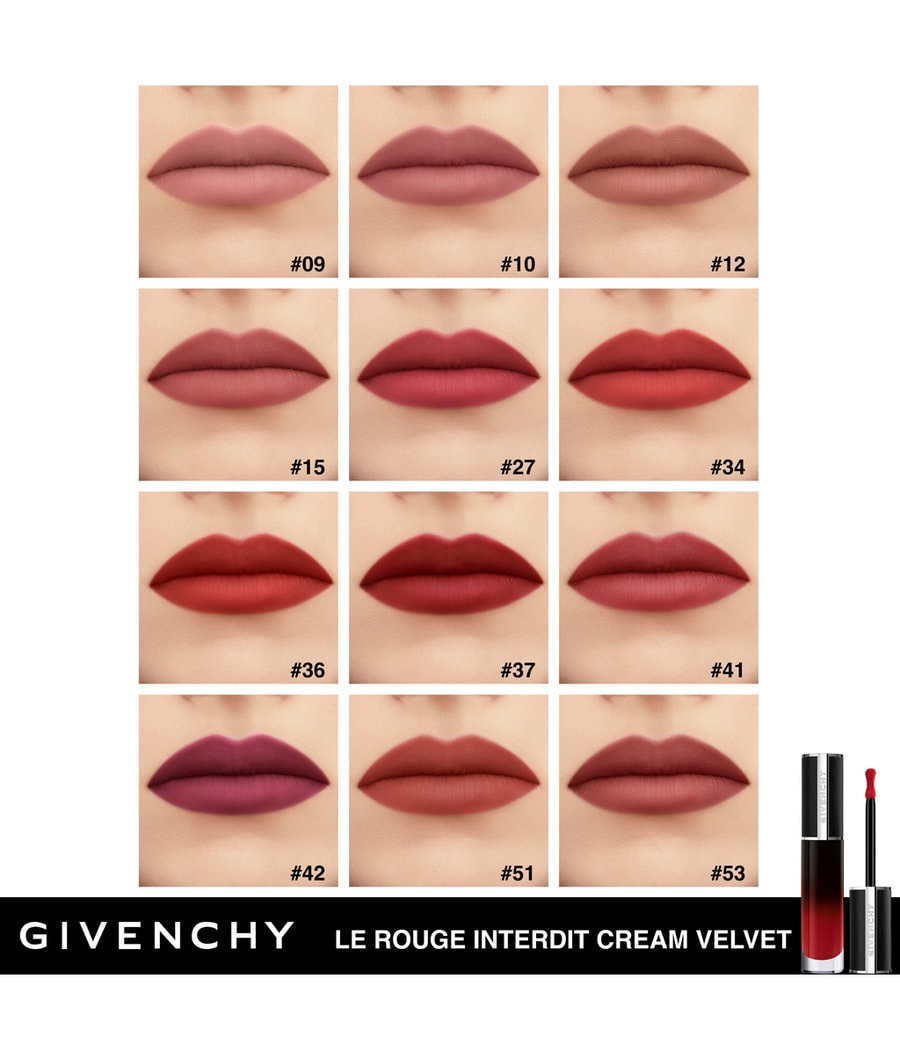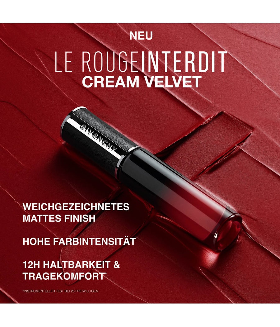 Откройте для себя эффект мягкого фокуса от новой кремово-матовой помады интенсивного цвета Givenchy Le Rouge Interdit Cream Velvet. Ультрасенсорная формула обеспечивает 12 часов увлажнения *** и обволакивает губы 12-часовой стойкостью ** и комфортом при ношении *. Первая жидкая кремовая помада от Givenchy, которая сочетает в себе незаметно легкую бархатистую пленку с невероятной интенсивностью цвета. Le Rouge Interdit Cream Velvet имеет современную модную кепку из натуральной черной кожи и одета в прозрачный стеклянный флакон с элегантным черным градиентом. Футляр украшен серебряной эмблемой 4G и напоминает логотип дома в стиле Givenchy Couture. Упаковка изготовлена из стекла и на 30% из переработанного пластика. Это часть концепции сокращения использования ископаемого пластика на 30% к 2025 году (по сравнению с 2017 годом). Помада доступна в 13 оттенках с высокой пигментацией, которые создают матовый эффект мягкого фокуса и подходят к любому тону кожи.