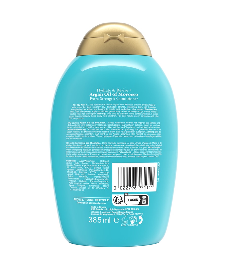 Увлажняющий и восстанавливающий марокканский кондиционер OGX с аргановым маслом Марокко, содержащий ценное марокканское аргановое масло и протеины шелка, восстанавливает сухие, поврежденные и ломкие волосы. Кондиционер для ухода за волосами интенсивно увлажняет, восстанавливает, уменьшает ломкость и делает волосы шелковисто-мягкими и укрепленными. Кондиционер для волос со сбалансированным pH, особенно приятным ароматом, без силиконов, без сульфатсодержащих поверхностно-активных веществ и без парабенов повышает упругость и эластичность волос и идеально подходит для волос средней и грубой длины.