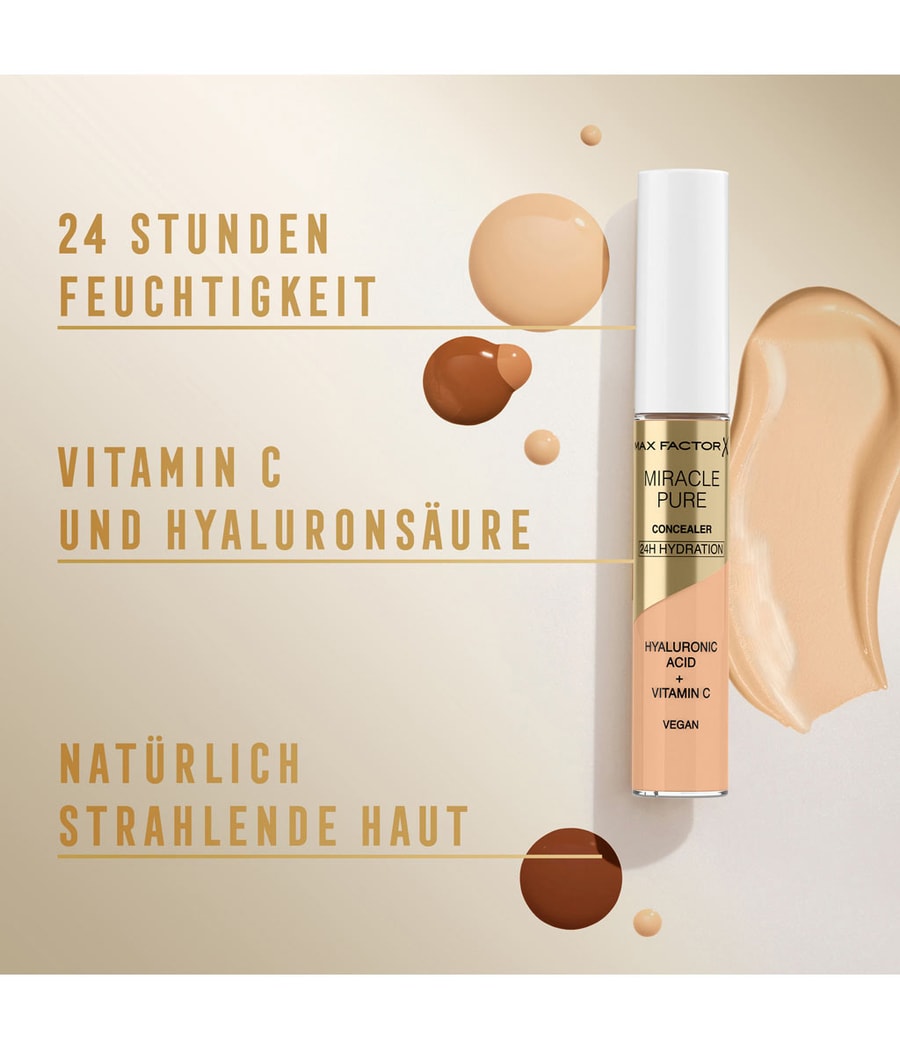 Улучшающий кожу консилер, который питает кожу при ношении: Веганский консилер Max Factor Miracle Pure Concealer обеспечивает сияющее, ровное послевкусие и обогащен питательными ингредиентами. Кожа становится лучше благодаря легкой формуле гиалуроновой кислоты, витамина С и пептидов при ношении. Благодаря естественному покрытию консилер идеально растушевывается на лице и под глазами. Поскольку он не образует складок, консилер Miracle Pure обеспечивает мягкое покрытие в течение всего дня, осветляя и увлажняя кожу. Он прошел клинические и дерматологические испытания и подходит для чувствительной кожи. Доступен в 4 оттенках в сочетании с косметикой Max Factor Miracle Pure для улучшения состояния кожи.