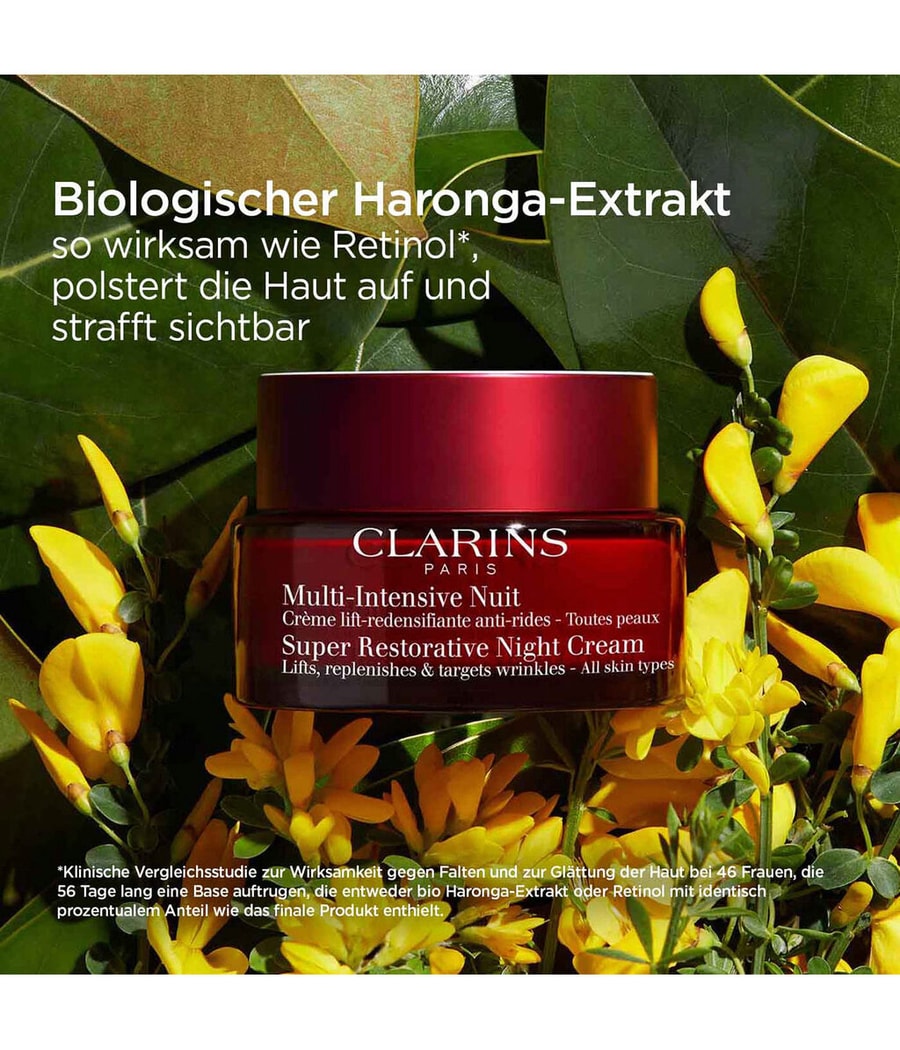Ночной крем для лица с исключительной текстурой смягчает негативные последствия возрастных гормональных изменений на коже. Кожа мгновенно становится более гладкой, а цвет лица с каждой ночью становится более ровным, словно подтянутым. Кожа сияет после пробуждения. Ваш секрет? Мощный дуэт растительного происхождения: органический экстракт харонги, натуральный активный ингредиент, столь же эффективный, как ретинол*, и органический экстракт дрока способствуют повышению плотности кожи и эффекту лифтинга, противодействуя потере эластичности. Морщины заметно разглаживаются. Кожа становится более упругой, гладкой и сияющей. Свежий, нежный цветочный аромат с пудровой сердечной нотой оставляет приятное ощущение. Содержит комплекс Clarins Anti-Pollution.*Клиническое сравнительное исследование эффективности против морщин и разглаживания кожи с участием 46 женщин, которые наносили основу, содержащую либо органический экстракт харонги, либо ретинол в том же процентном соотношении, что и конечный продукт, в течение 56 дней.