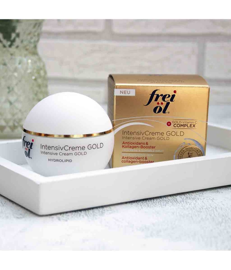 Особенно глубоко действующий frei öl Intensive Cream GOLD с высококонцентрированным витамином С, связанным с мельчайшими частицами золота, действует в два раза эффективнее, глубоко в коже: 1. Являясь мощным антиоксидантом, витамин С защищает кожу от свободных радикалов. 2. Помогает коже вырабатывать новый коллаген и разглаживать морщины. Эффективно стимулируется защита клеток и укрепляется структура кожи. Питательное масло жожоба и увлажняющий алоэ вера дополняют эту замечательную композицию и дарят коже длительное сияние молодости.