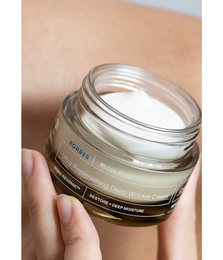 Интенсивно увлажняющий крем с технологией Meno-Reverse и собственным экстрактом белой сосны KORRES борется с потерей влаги в коже после менопаузы, оказывает регенерирующее действие и обеспечивает более упругую и молодую кожу. Формула с растительными маслами и сливочным маслом снижает трансэпидермальную потерю воды, улучшает липидный барьер кожи и идеально подходит для очень сухой и обезвоженной кожи.