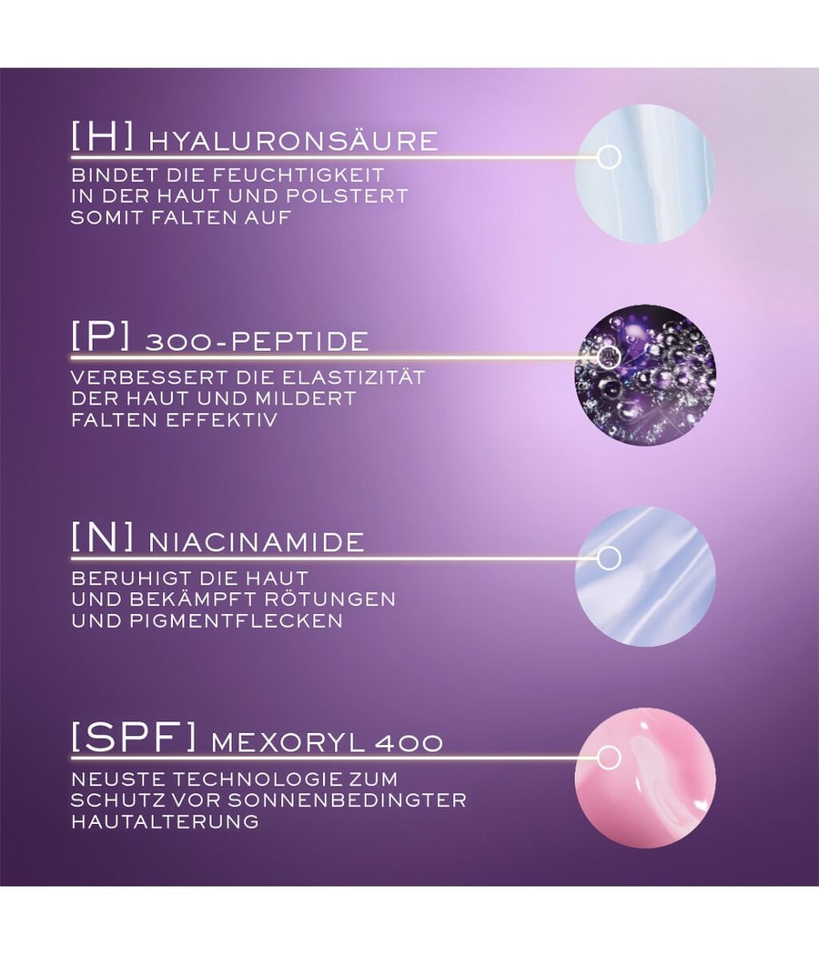 Крем для лица Lancôme Rénergie SPF50 HPNUVMUNE предотвращает появление морщин и темных пятен благодаря высокой степени защиты от УФ-излучения и антивозрастным пептидам. Эта формула воздействует на самые длинные лучи UVA, которые участвуют в развитии признаков фотостарения (темные пятна, дряблость кожи, морщины). Он объединяет более 300 различных пептидов, гиалуроновую кислоту и ниацинамид в инновационной формуле для полного спектра антивозрастного действия: 9 из 10 женщин не чувствуют, что наносят SPF*