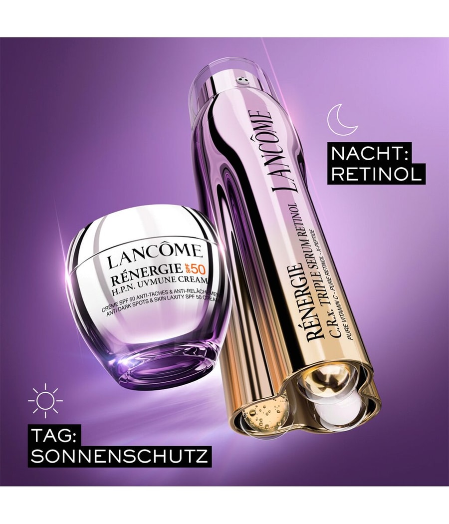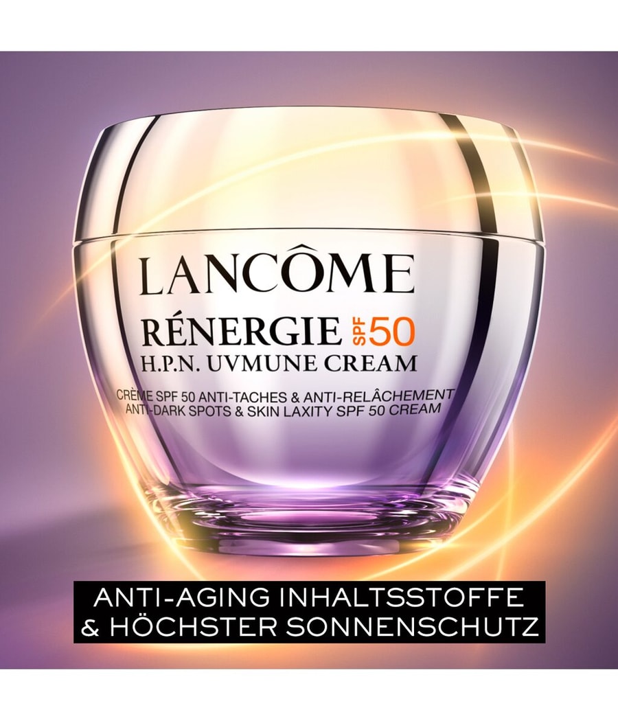 Крем для лица Lancôme Rénergie SPF50 H.P.N.UVMUNE с высокой защитой от ультрафиолета и антивозрастными пептидами предотвращает появление морщин и темных пятен. Эта формула нацелена на самые длинные лучи UVA, которые участвуют в появлении признаков фотостарения (темные пятна, дряблость кожи, морщины). Он объединяет более 300 различных пептидов, гиалуроновой кислоты и ниацинамида в инновационную формулу для полного антивозрастного эффекта: 9 из 10 женщин не чувствуют, что применяют SPF *