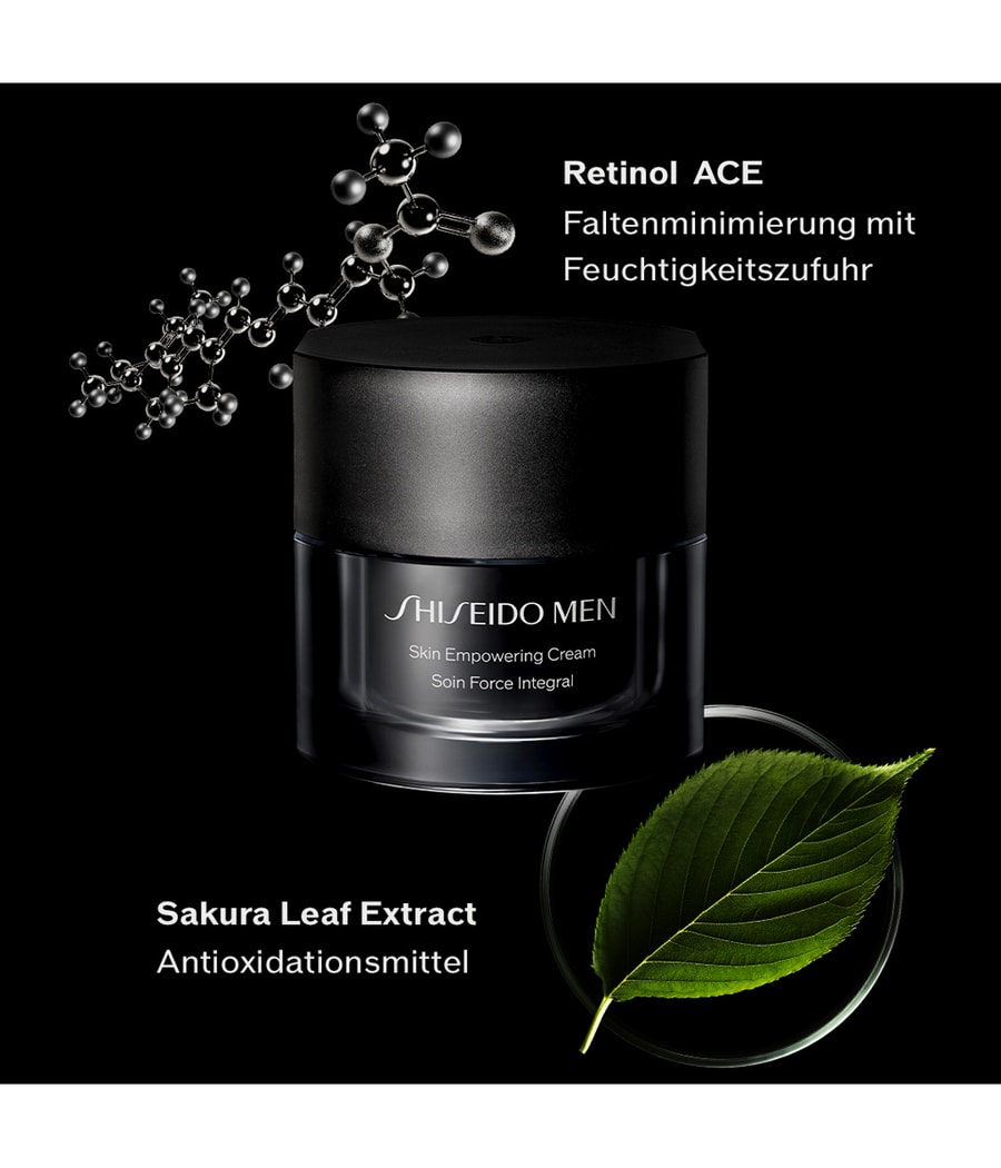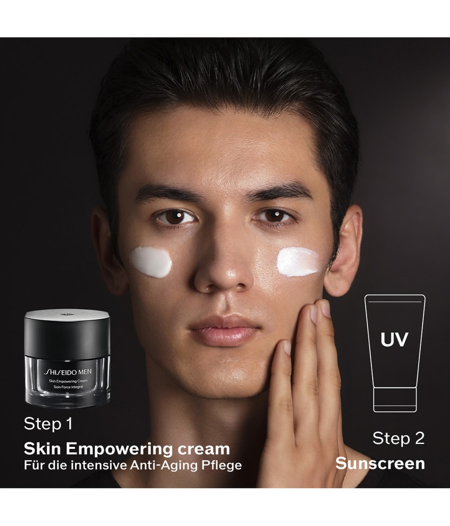 Крем для укрепления кожи. Новый антивозрастной крем для укрепления и восстановления кожи. Улучшенный крем Skin Empowering Cream создан на основе исследований Shiseido, согласно которым у мужчин признаки старения, такие как глубокие морщины, потеря эластичности и обвисание, начинают проявляться в возрасте 40 лет (на 10 лет раньше, чем у женщин). Технология эмульсии Soft Shell Благодаря уникальной технологии эмульсии Soft Shell от Shiseido средство заметно разглаживает морщины, повышает упругость кожи и предотвращает потерю эластичности. Роскошная, насыщенная текстура быстро впитывается и обеспечивает коже 48 часов увлажнения*. Кожа выглядит свежей, упругой и ощущается более молодой. + 100 лет исследований мужской кожиМолодая и крепкая кожа всего за 1 неделю*. Основные ингредиенты: - Экстракт листьев сомеи ёсино: антиоксидантные свойства - Ретино-АПФ: способствует уменьшению морщин, выработке АТФ/ГК - Экстракт семян цубаки (камелии): антиоксидантные свойства - Дикалия глицирризинат: помогает замедлить процесс старения кожи *Потребительский тест с участием 100 человек Как пополнить запас? - Вставьте палец в вертикальный паз в отверстии контейнера и осторожно потяните контейнер вверх. - Вставьте сменную капсулу в контейнер и сильно нажмите на нее, прежде чем вынуть капсулу. - Если контейнер или капсула больше не пригодны для использования, замените их новой баночкой крема SHISEIDO MEN Skin Empowering Cream. - После очищения и/или бритья нанесите средство на лицо восходящими движениями. - Для обеспечения эффективности Retino-ACE используйте солнцезащитный крем в течение дня.