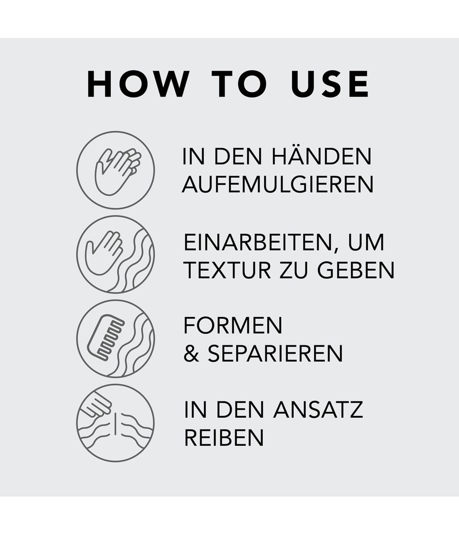 нанесите эмульсию на руки и нанесите на сухие волосы для придания формы и акцентирования деталей; придает сухой матовый оттенок. Лучше всего подходит для коротких и средних волос.