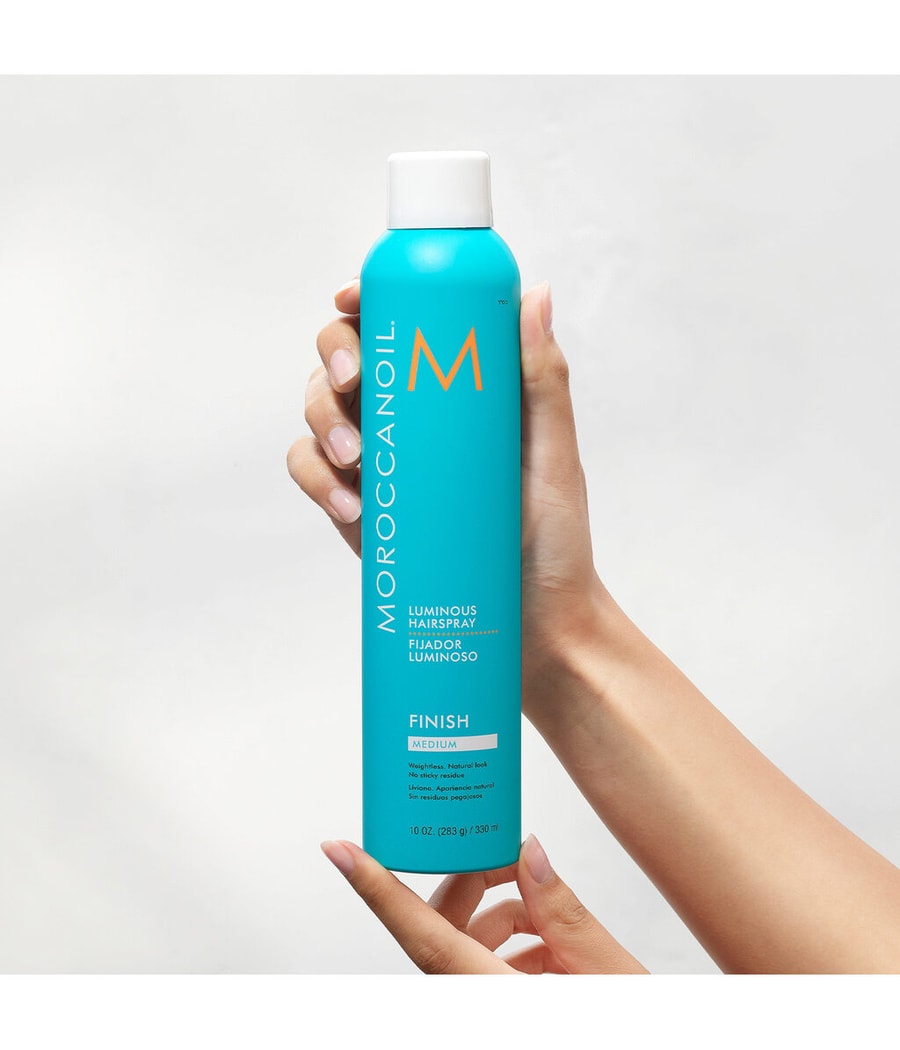Держите баллончик с лаком для волос Moroccanoil Luminous на расстоянии 25 см от волос и распылите спрей для средней фиксации.