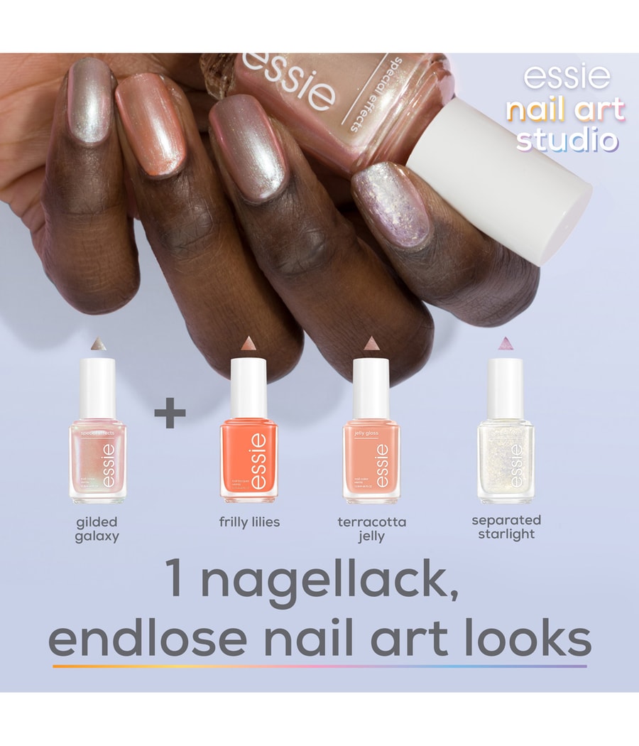 Лак для ногтей Essie Special effects создает настоящие особые эффекты на ногтях. Его эксклюзивная технология Pearl позволяет наносить на ногти лак салонного качества. Его блестящие чешуйки или частицы хрома придают ногтям светоотражающий или шелковистый блеск. Лак для ногтей Special effect можно использовать для создания множества образов, независимо от того, используется ли он отдельно или в качестве верхнего слоя.