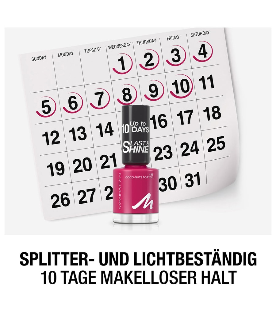 Никогда не обходитесь без лака для ногтей: лак для ногтей Manhattan Last & Shine в оттенках 151 Tanline + GDTimes - это средство для придания блеска и цвета вашим ногтям! Быстросохнущий лак для ногтей бывает бесчисленного множества насыщенных и блестящих оттенков, подходящих для любого стиля и настроения. Благодаря широкой 2-камерной кисти вам понадобится всего одно нанесение для полного сияния цвета – так ваши ногти будут покрыты лаком в одно мгновение. Запатентованная формула с технологией непрерывного выпуска обеспечивает стойкость и стойкость цвета до 10 дней – никаких сколов, выцветания, только интенсивный цвет!