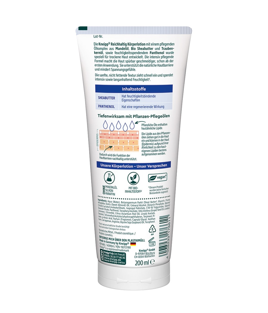 Насыщенный лосьон для тела Kneipp с питательным масляным комплексом из миндального масла, органического масла ши и масла виноградных косточек, а также увлажняющего пантенола разработан специально для сухой кожи. Интенсивно питательная формула делает кожу заметно более эластичной уже с первого применения. Он поддерживает естественный кожный барьер и снимает чувство напряжения. Нежная нежирная текстура быстро впитывается и обеспечивает интенсивное и продолжительное увлажнение (подтверждено научными исследованиями). Глубоко действует с растительными питательными маслами. Растительные масла содержат липиды, похожие на кожные. Липиды из растительных масел хорошо впитываются в кожу и могут хорошо впитываться в кожу (эпидермис) благодаря своему сходству с собственными липидами кожи. Это обеспечивает длительную поддержку функции кожного барьера. Дерматологически подтвержденная кожная совместимость. Без минерального масла, силикона и парафина.