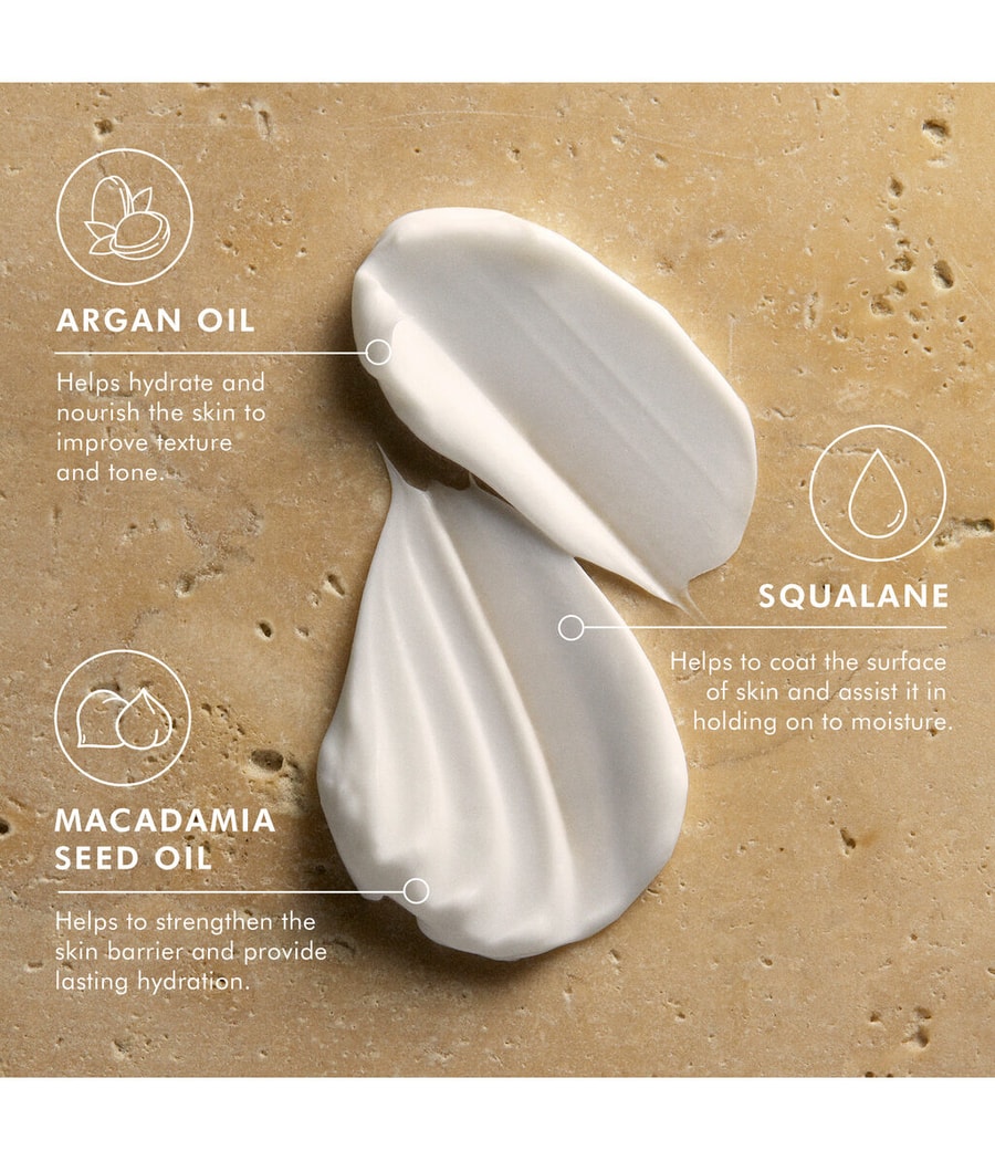 Легкий взбитый увлажняющий крем для тела с увлажняющим скваланом и восстанавливающей смесью масел арганы, авокадо и семян макадамии.
