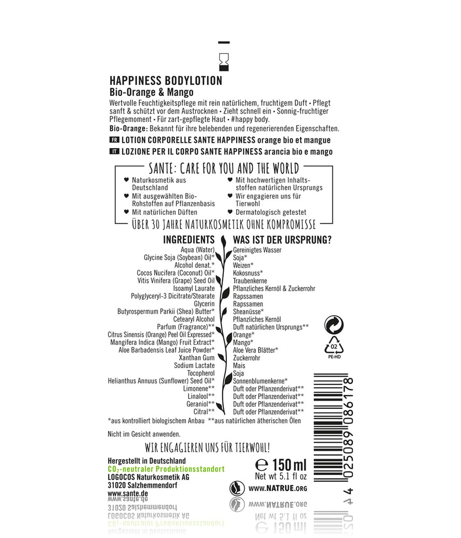 Органический ЛОСЬОН ДЛЯ ТЕЛА SANTE HAPPINESS Orange & Mango с тропическим ароматом обеспечивает ценную влагу для нормальной и сухой кожи. Мягкая формула с органическим маслом жожоба и органическим маслом купуасу смягчает и смягчает кожу, делая ее мягкой на ощупь. Солнечно-фруктовый уход.